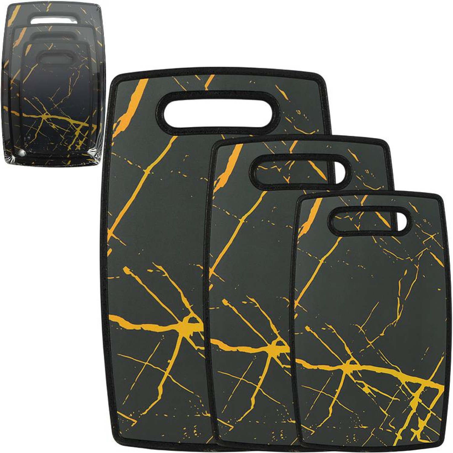 Набір обробних дощок з мармуровим візерунком складається з 3 дощок розмірів 24х15х1 см, 19х29х1 см та 22х36х1 см. Набір зручний для різних кухонних процесів і розділення продуктів. Підходить для нарізання овочів, фруктів, мяса, риби та хліба. Міцна поверхня легко миється, не вбирає запахи та підходить для щоденного використання. Мармуровий дизайн гармонійно доповнює інтерєр кухні.