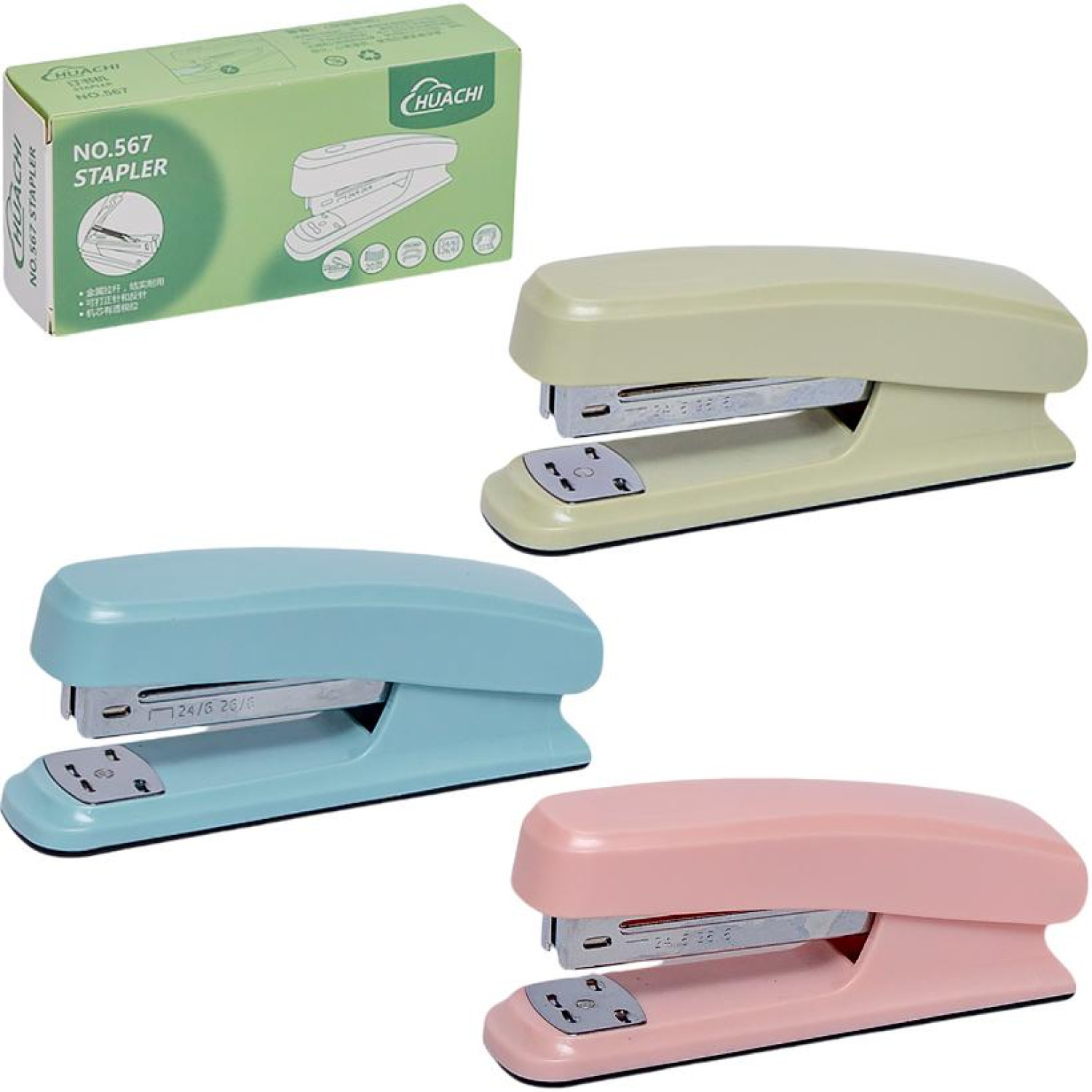 Степлер має металевий механізм з пластиковою накладкою, яка перешкоджає ковзанню руки, що робить роботу з ним комфортною. Скоба № 24, 26, максимальна глибина закладки паперу: 55 мм, пробивна потужність до 20 аркушів. Розмір степлера 120х50х30 мм.
