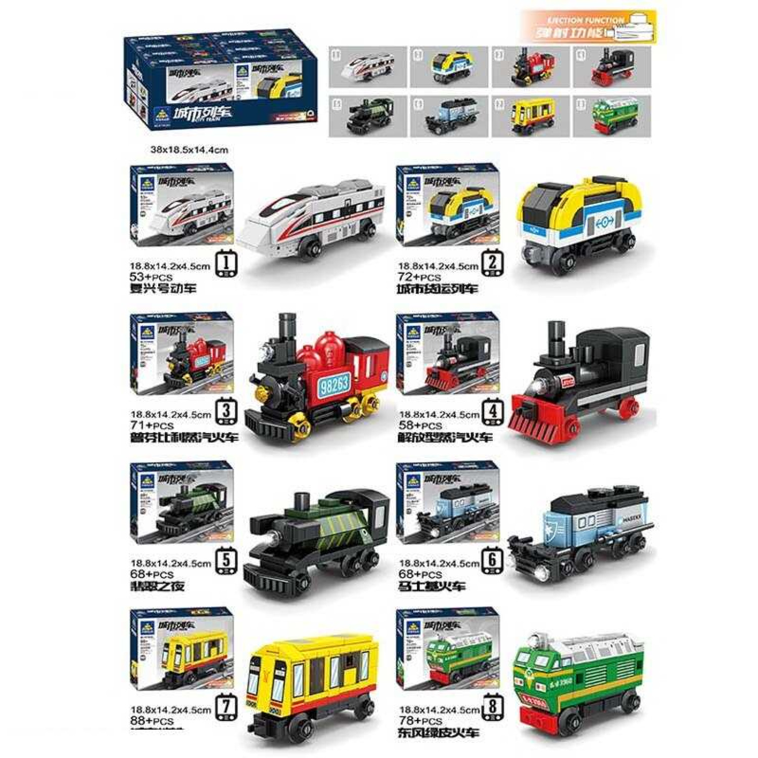 Конструктор #1-8 8шт в кор., “Потяги”, сер кі-ть елементів 69, механічний запускач, в кор.18*15*5см