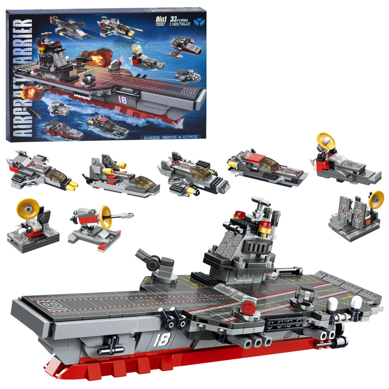 Особливості: Конструктор 8в1. Авіаносець розміром 22,4 см. Кількість деталей: 617. Тип з'єднання: блоковий. Упаковка: коробка 42х27х6,5 см.