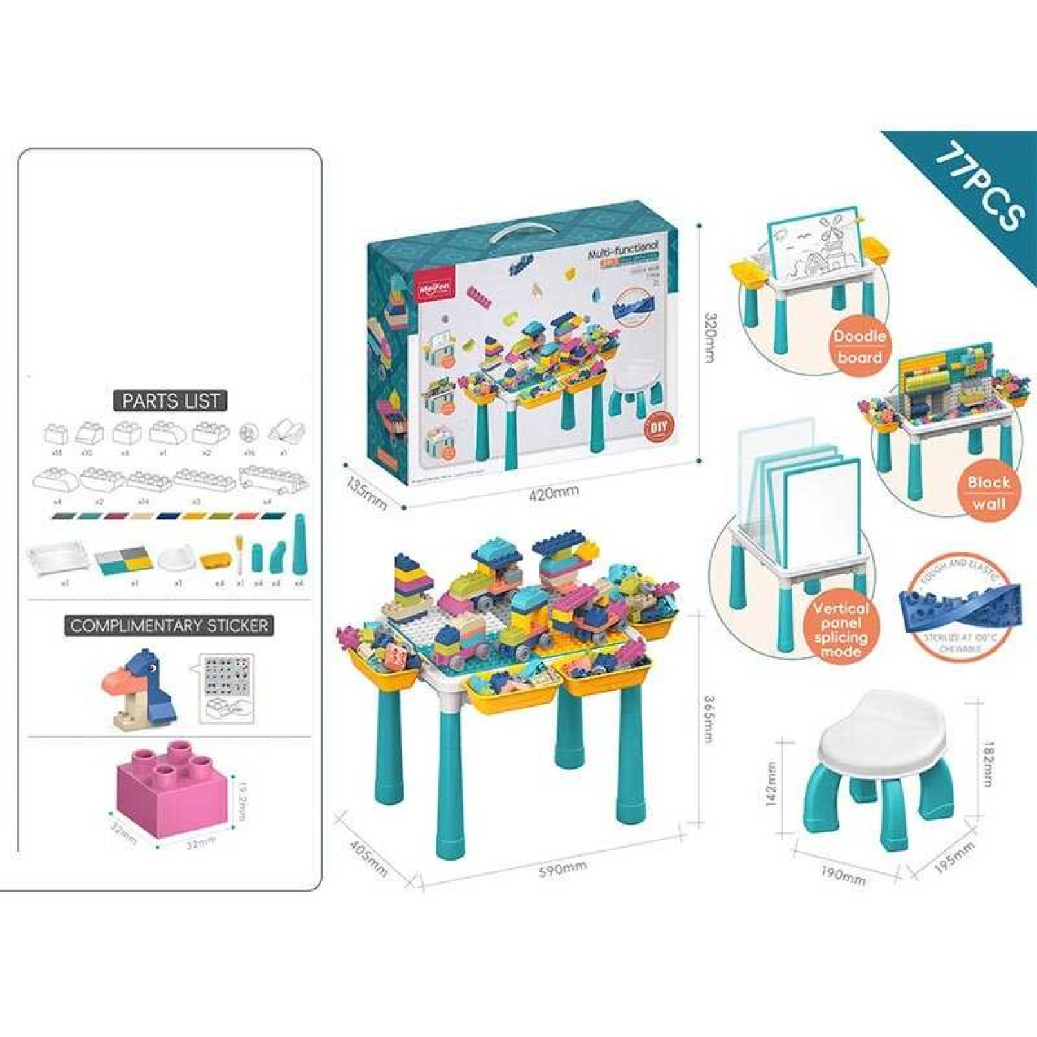 Особливості: Розмір столика: 59х40.5х36.5 см. Розмір стільчика: 19х19.5х18.2 см. Зворотня сторона столика - дошка для малювання маркером "пиши-витирай". Маркер "пиши-витирай". 77 деталей. Пазовий тип зєднання. Еластичні гумові деталі. Великі деталі.
