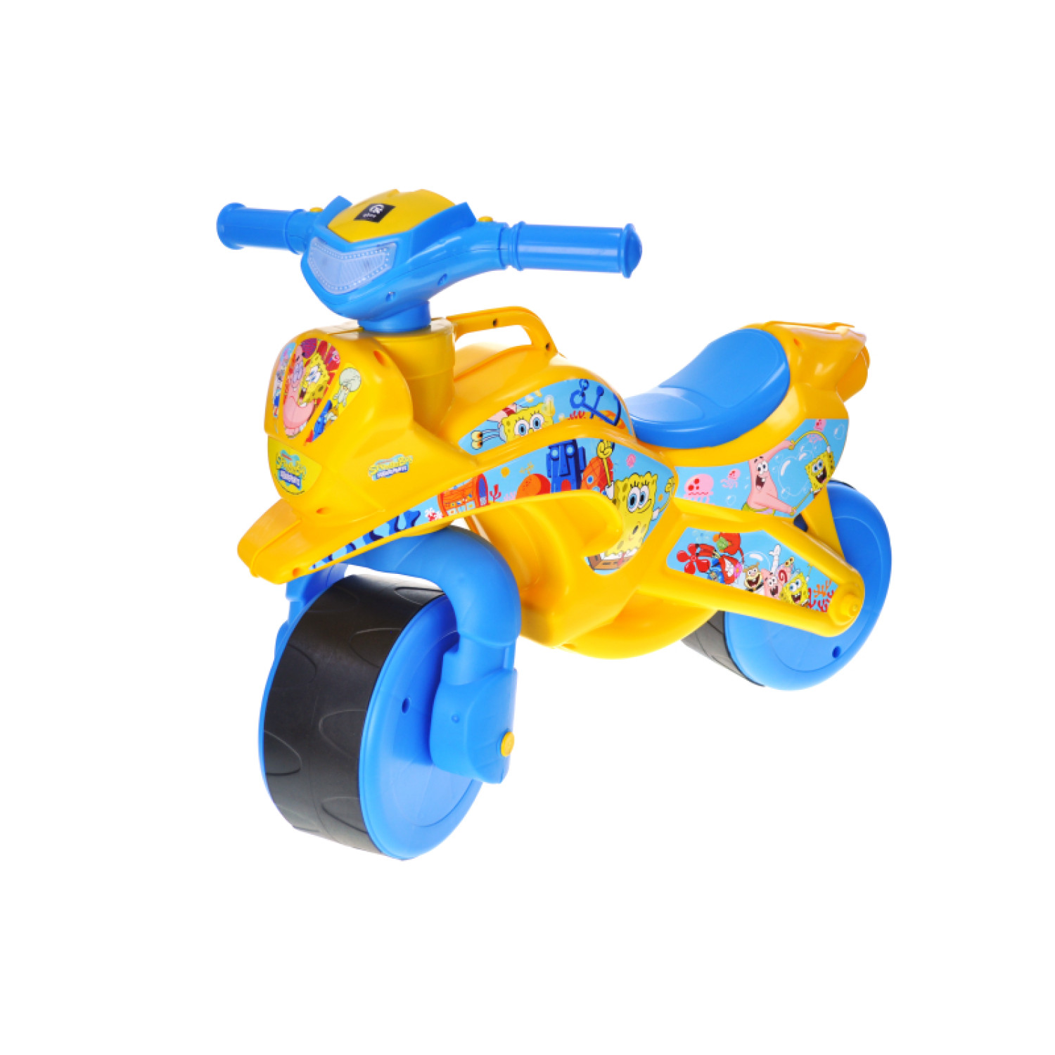 Сучасний дитячий мотоцикл у кольоровій гамі жовтого та блакитного створений для маленьких шанувальників мультсеріалу SpongeBob. Малюку достатньо відштовхнутися ніжками, щоб почати рух. Зручне кермо допомагає впевнено триматися, а широкі колеса забезпечують стійкість на будь-якому покритті. Легкий і водночас міцний пластик робить виріб надійним та довговічним. Дизайн прикрашений яскравими наліпками з героями мультфільму, завдяки чому іграшка виглядає стильно та одразу впізнається дітьми. Розміри виробу: 70х32х52 см, висота до сидіння - 32 см, діаметр коліс - 20 см. Максимальне навантаження: до 30 кг. Вага: 2,9 кг. Розмір пакування: 37х69х52 см.