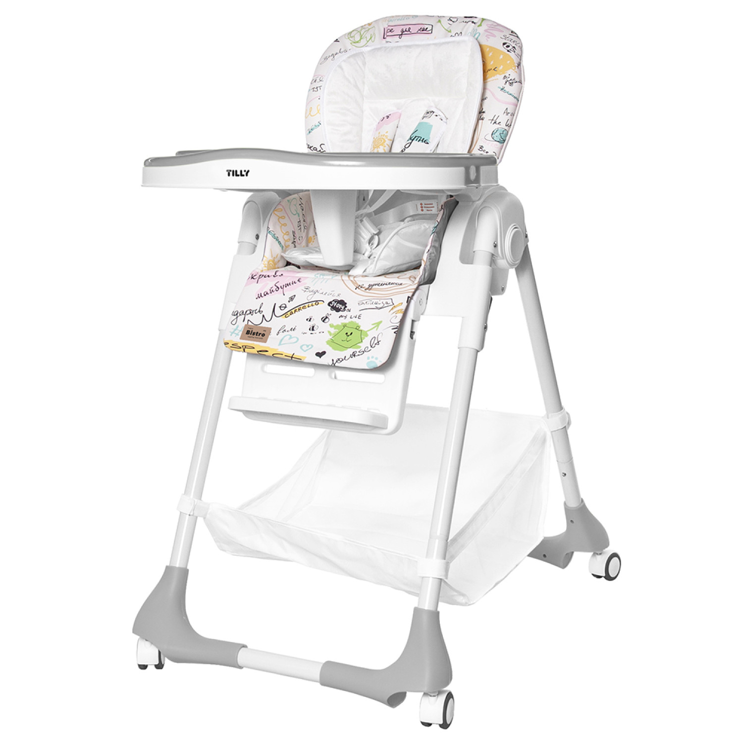 Стульчик для кормления BABY TILLY Bistro. Характеристики модели: - Размеры 104*76*61 см, - Размеры в сложенном виде 100*40*61 см, - Регулировка по высоте: 6 положений, - Регулировка спинки: 3 положения, - Подставка для ножек, - Столешница съемная, - Корзина для игрушек, - Ремень безопасности: 5-ти точечный, - 4 колеса.