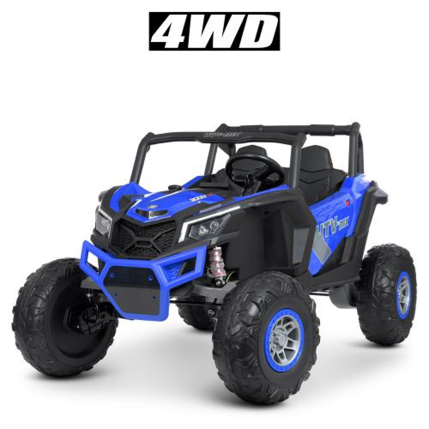 Одне 2-х-місцеве посадкове місце з шкіряним сидінням. Посадкове місце обладнане 2-ма 2-х точковими ременями безпеки. Передні і задні фари світяться. Кнопка вмикання/вимикання світла. Приємна музика. Регулювання гучності. Можливе підключення Bluetooth (STOP BUTTON), а також є MP4 монітор, MP3, USB, SD-роз'єм з картою пам'яті. 4 колеса виконані з Eva-матеріалу. Передні і задні амортизатори. 2 швидкості руху в машині і 3 на пульті. Потужність двигуна: 4х12V/RPM10000/45W. Акумулятор: 1х12V/12Ah. Час роботи без підзарядки: 60-120 хвилин. Час зарядки батареї: 8-12 годин. Розміри електромобіля (ДхШхВ): 142х92х85 см. Вага: 35 кг. Діаметр колеса: 39 см. Діаметр дисків: 18 см. Максимальне навантаження: 50 кг.
