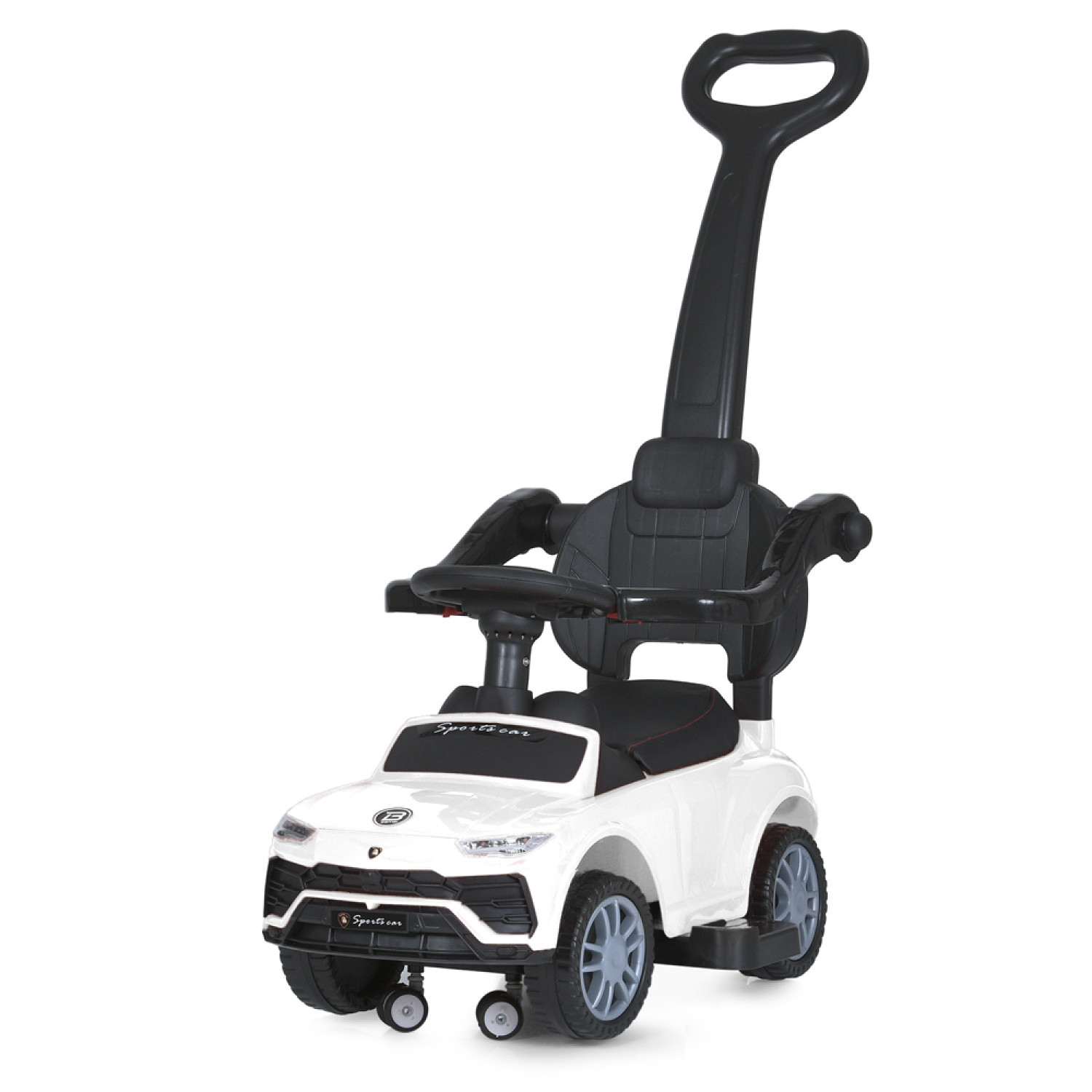 Машинка має зручне сидіння з еко-шкіри з високою спинкою. Ширина сидіння: 21 см. Обмежувальний бампер знімається зі зростанням дитини. Предбачено підніжку та додаткові знімні коліщатка. Їзда супроводжується музикою. Передні фари світяться кольрами під час програвання музики. 4 пластикові колеса 14 см. Матеріал: ударостійкий пластик. Живлення: 2 батарейки типу АА (у комплект не входять). Розміри каталки з ручкою (ДхШ(з підставкою для ніг)хВ): 86х42х87 см. Розміри каталки без ручки (ДхШ(по колесам): 65х29 см. Висота до спинки: 49 см. Висота до батьківської ручки: 87 см. Висота до керма: 39 см. Висота від підлоги до сидіння: 24 см. Висота від підставки для ніг до сидіння: 17 см. Вага: 3,9 кг. Максимальне навантаження: 30 кг.