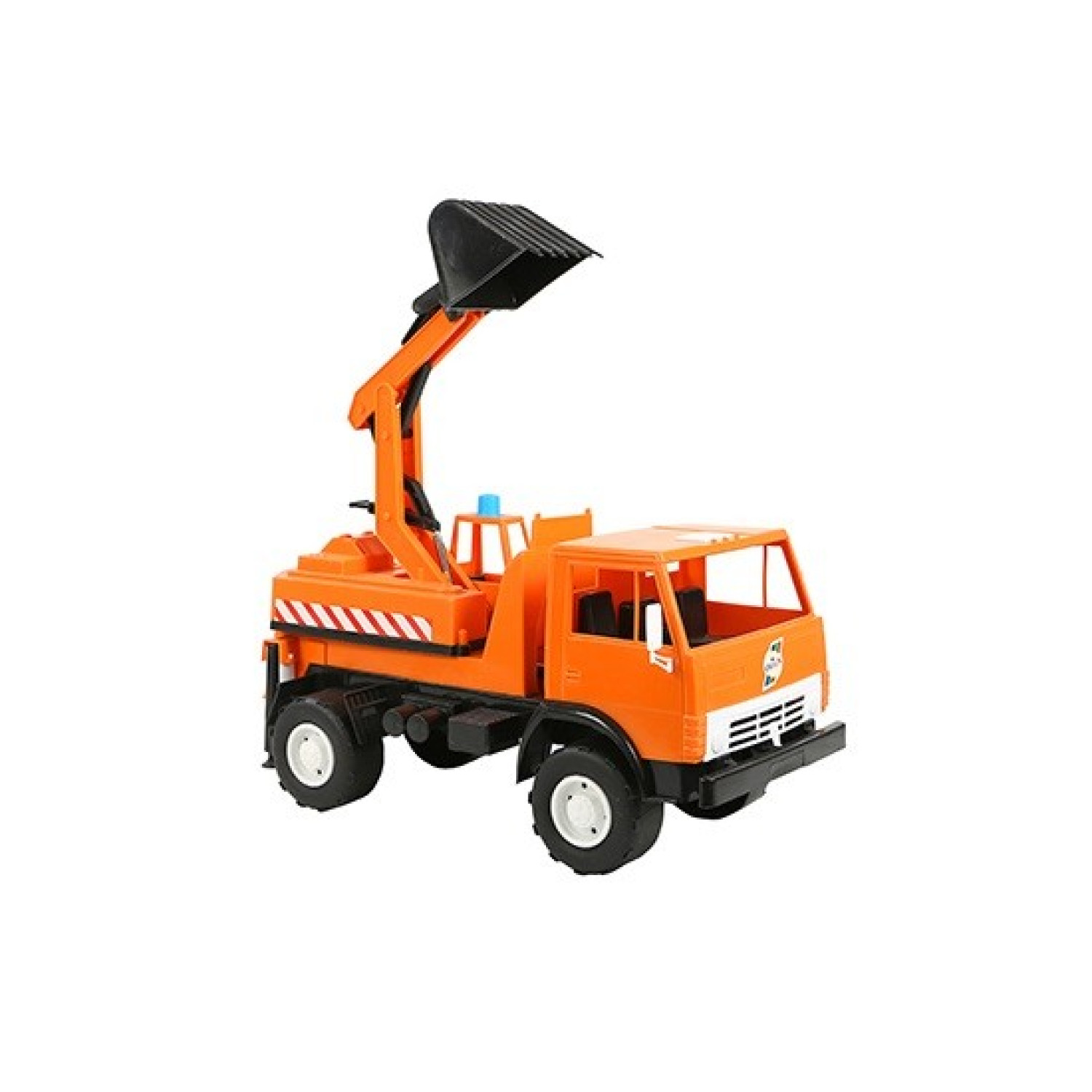 Колеса заполнены протекторами,кабина открытая ,оснащена рулем и водительским креслом. Позади самой кабины установлен подвижной ковш,который поднимается и опускается.Ковш и упоры для устойчивости могут двигаться. Материал машины: пластмасса. Длина-41 см,ширина-20см,высота -27 см. Упаковка: сетка