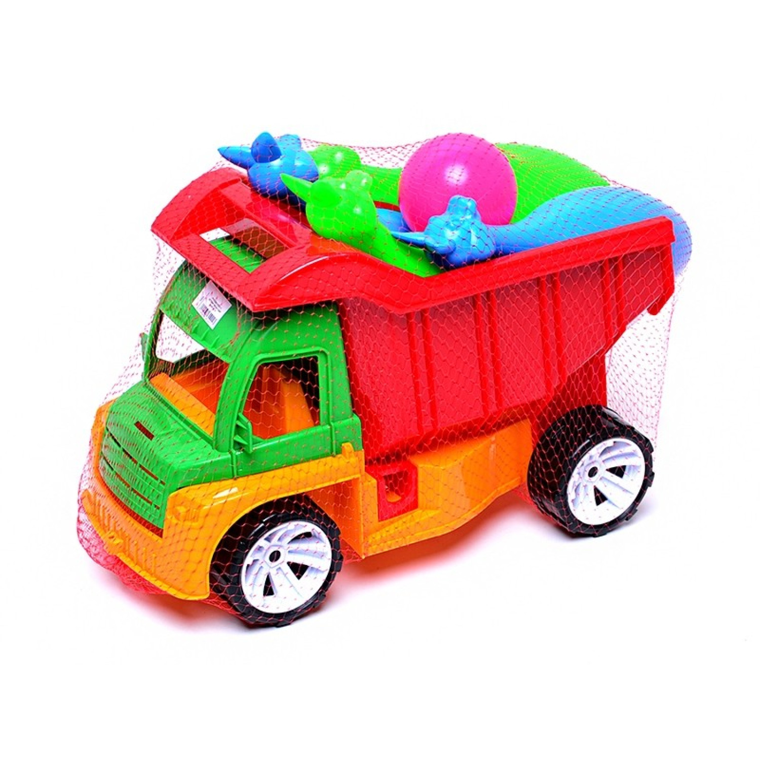 Грузовик с откидным кузовом. Двери не открываются. В комплекте с машинкой 4 цветных кегли и шарик. Упаковка: сетка.