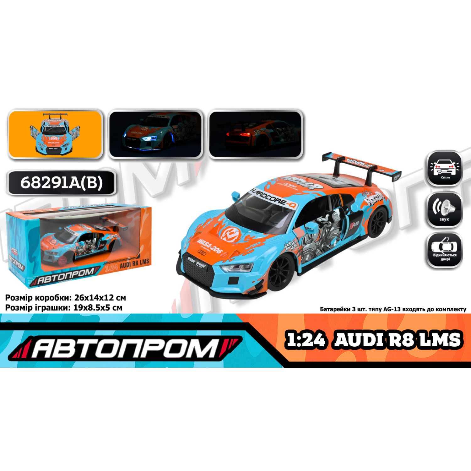 Машина мет. АВТОПРОМ 1:24 Audi R8 LMS, батар,світло,звук,відкр.двері,кор. /12-2/