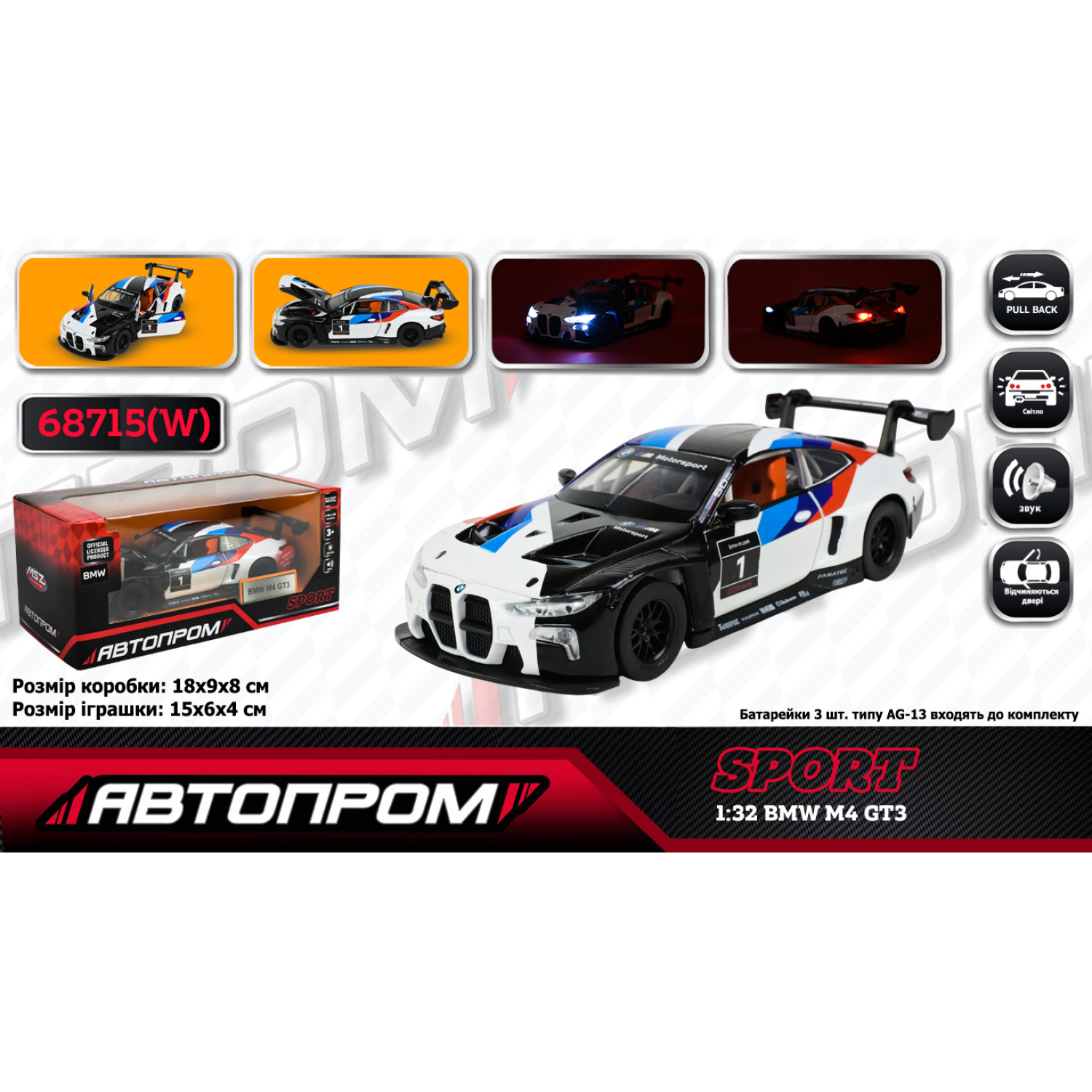 Машина мет. АВТОПРОМ 1:32 "BMW M4 GT3", батар, світ., звук, відкр.двері, кор.18 * 9 * 8 см /48-2/