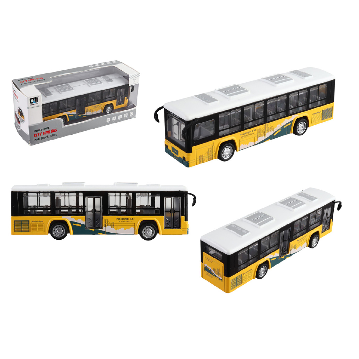Особливості: Іграшка виконана у формі міського автобуса. Автобус обладнаний інерційним механізмом. Двері відчиняються за допомогою важелів. Підсвічування фар і звуковий супровід руху, який активується натисканням на підвіску. Прогумовані колеса з протекторним візерунком. Додаткові ефекти працюють від батарейок, що входять до комплекту. Автобус виготовлено з металопластику.
