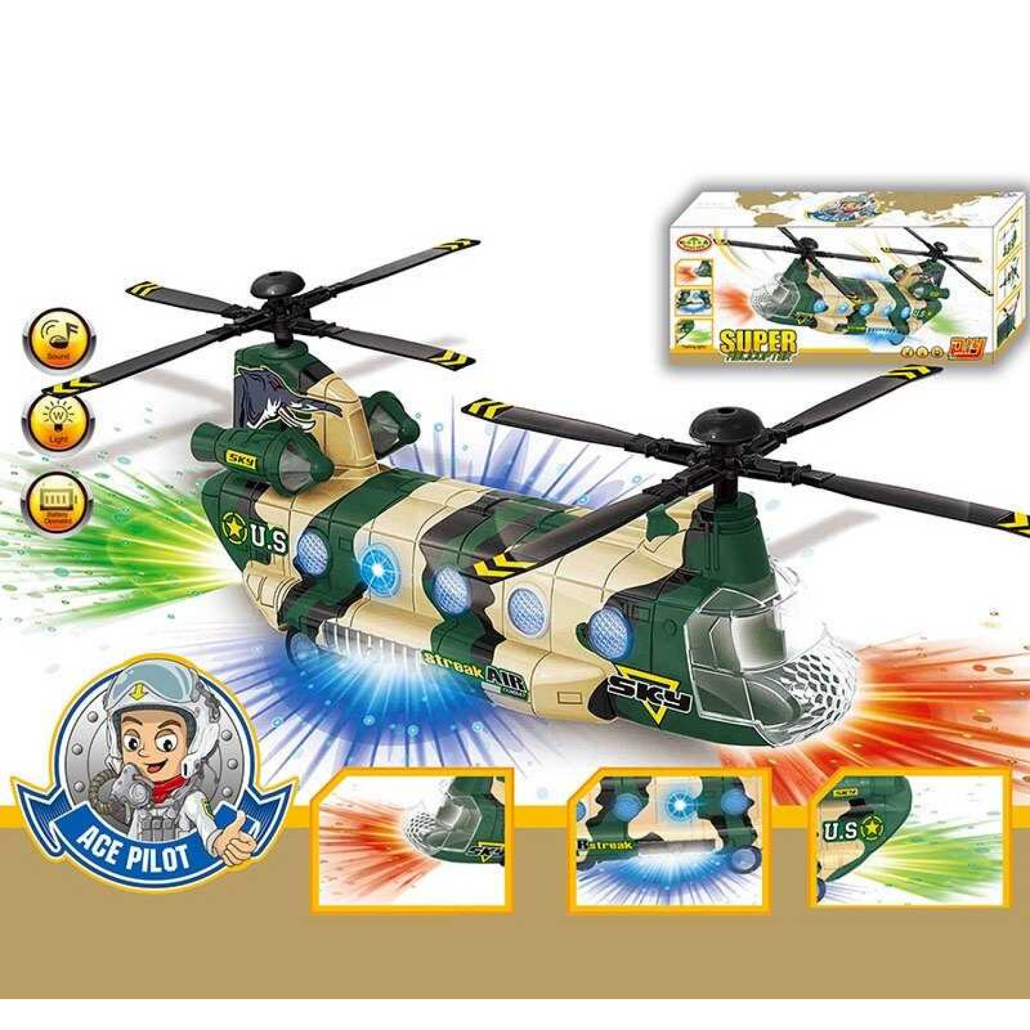 Гелікоптер звук, підсвічування, колесо вільного ходу, автоматичне обертання лопастей, в кор. 29*8,5*12,5 см /72-2/