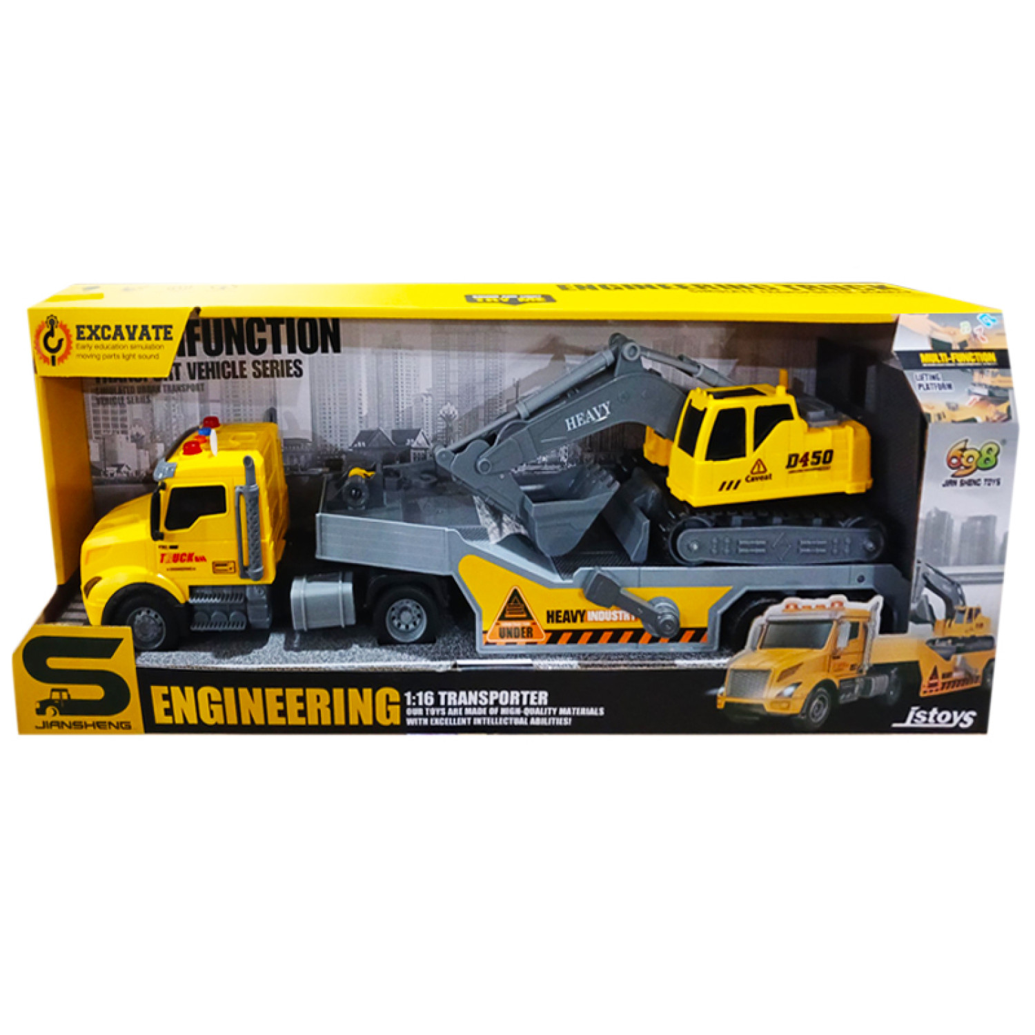 Особливості: Іграшка оснащена інерційним механізмом. В комплекті також екскаватор. Присутні світлові та звукові ефекти. Упаковка: коробка 52,5x12,5x18 см.