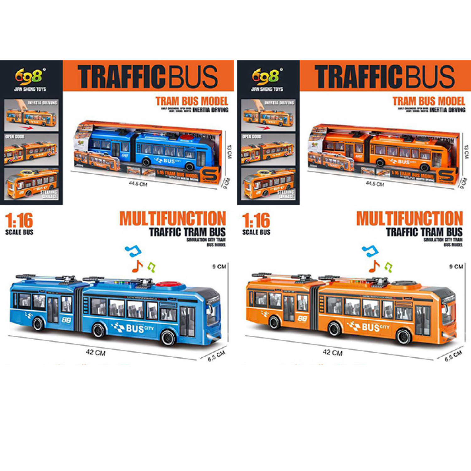 Тролейбус інерція, 40см, 1:16, звук, світло, 2 кольори, рухомі деталі, на бат-ці (табл), в кор-ці, 44-12,5-8,5см /18/