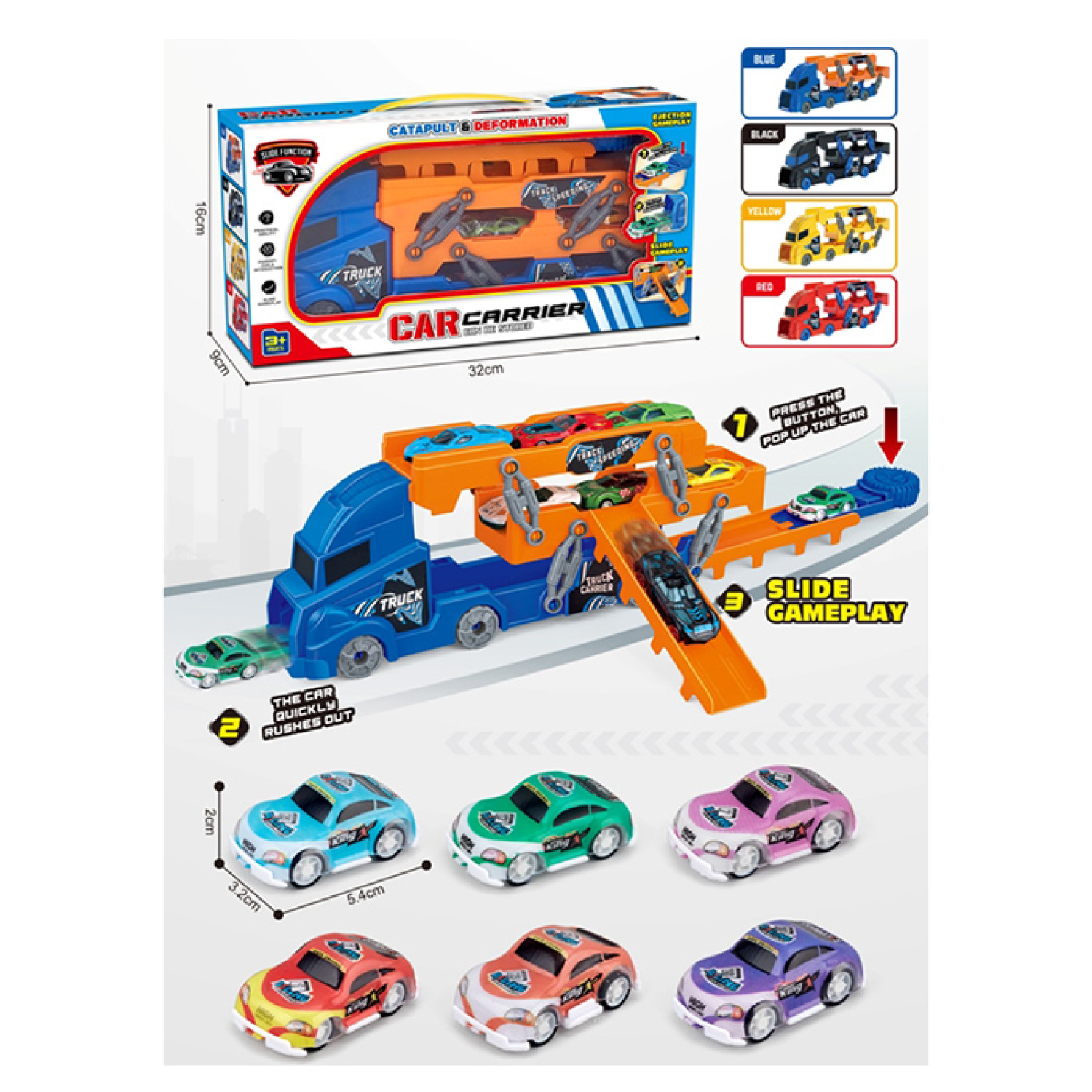Трейлер 2в1(трек, на запуску), 29см, машинки 6шт (6,5см, інерц, метал), 4 кольори, в кор-ці, 32-16-9см /30/