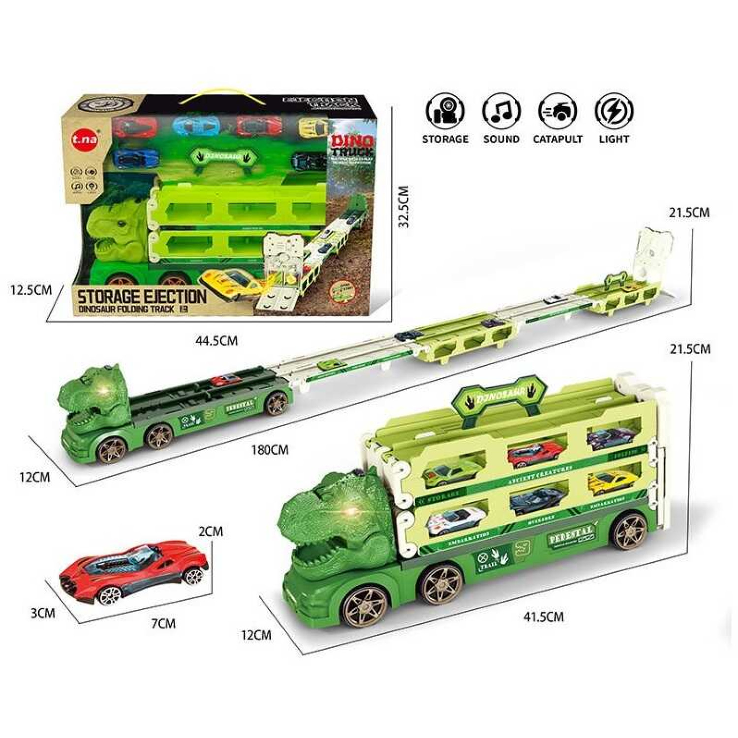Особливості: Розміри трейлера: 12х41.5х 21.5 см. Трейлер виконано у вигляді динозавра. Голова динозавра має підсвічування та відтворює аудіоефекти роботи двигуна, реву звірів та програє динамічну мелодію. Батарейки включено до набору. Трейлер розкладається у трек. Розміри треку: 12х180х21,5 см. Трек закінчується фінішною лінією, яка програє звуки оплесків, коли машинка її перетинає. 6 металопластикових машинок у комплекті. Розміри машинки: 7х3х2 см.