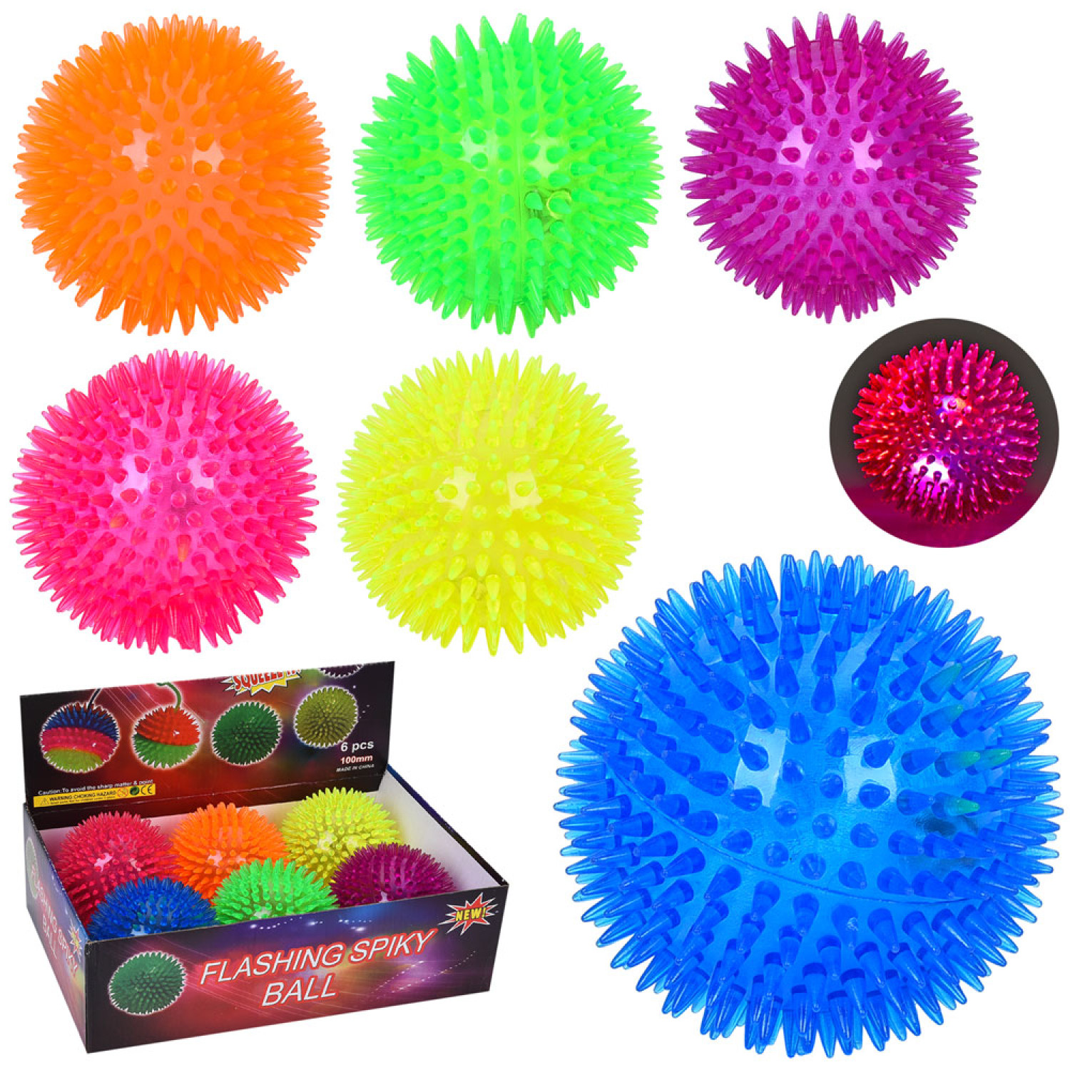 М'яч дитячий 10см, пискавка, масажний, світло, бат(табл), (6 кольорів), /12/72/6шт в кор. 30,5-10-20,5см