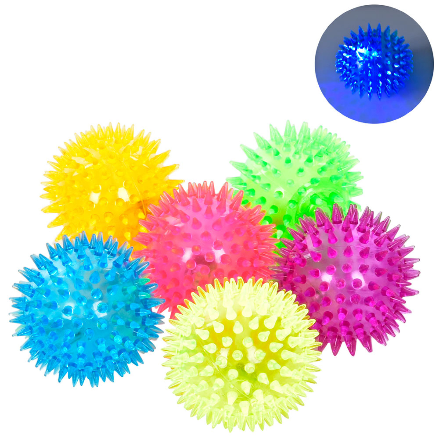 М'яч масажний 7,5см, пискавка,(6 кольорів),в п/е,світло,/20/240/12шт в кор. 31-22,5-8см