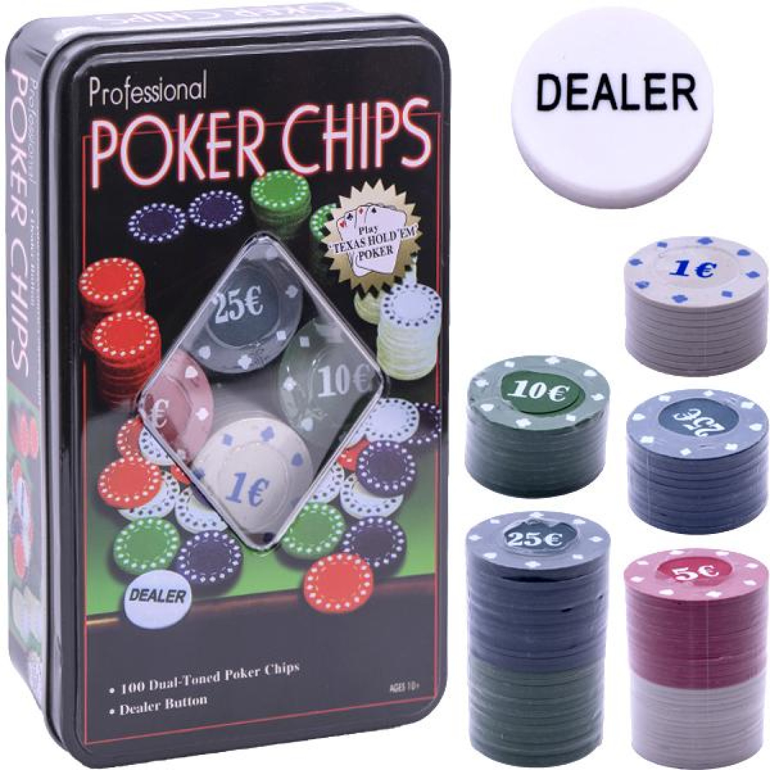 Набір для гри в покер на 100 фішок, відмінний вибір для 2-3 початківців гравців у покер. Комплектація: фішка дилера, 100 фішок для покеру. Упаковка - металевий бокс.