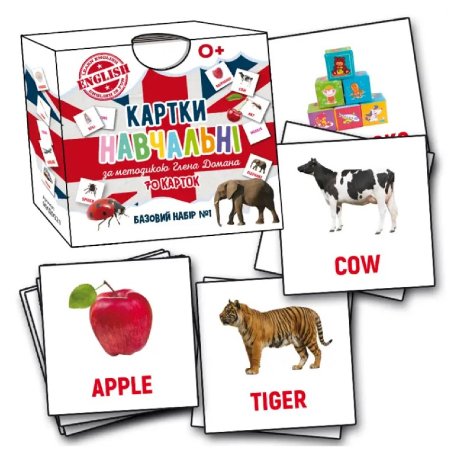 Базовий набір №1 популярних карток за методикою Глена Домана англійською мовою. Унікальна система раннього розвитку дитини Глена Домана допомагає в навчанні дітей читанню в ранньому віці - з народження до 3-5 років. Основний елемент у цьому - картки з яскравою реалістичною картинкою на білому фоні з чітким текстом бажано червоного кольору. Важливо! Показуючи дитині картинку, вимовляти все слово цілком, не ділячи його на літери і склади. Займатися з картками можна щодня по 1-3 хвилини кілька разів на день вже з 1,5-місячного віку. Починаючи з 3-5 карток, щотижня їх кількість можливо збільшувати на 2-5 карток. До комплекту входять картки з написом англійською за 10 темами: овочі (7 шт.), фрукти, ягоди (7 шт.), тварини (7 шт.), птахи (7 шт.), комахи (7 шт.), посуд (7 шт.), меблі (7 шт.), транспорт (7 шт.), іграшки (7 шт.), їжа (7 шт.). Тема підписана на зворотному боці картки. Комплектація: картки навчальні - 70 шт.