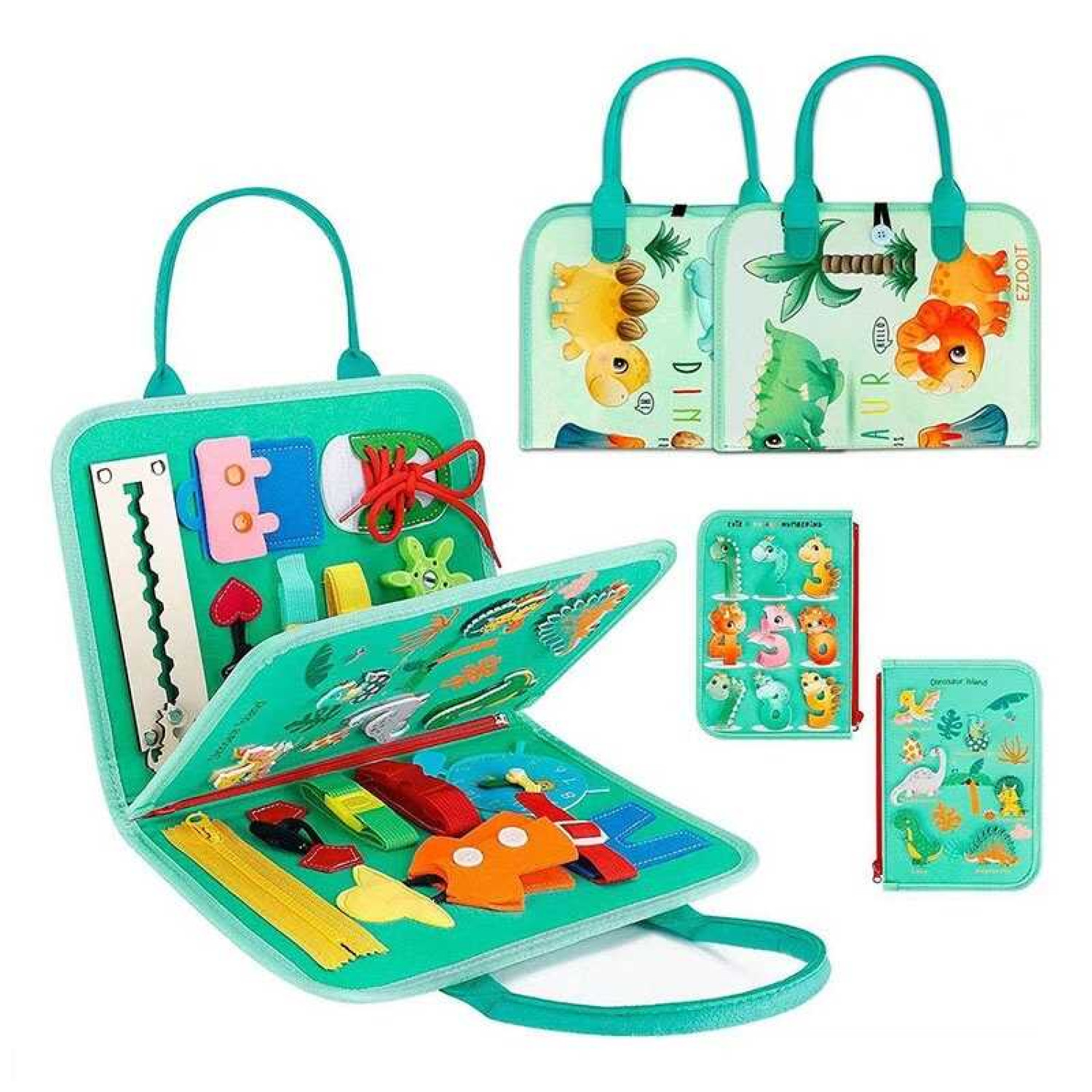 Особливості: Логічна папка має "сторінки" з різноманітними елементами для розвитку дитини. Циферблат з рухомими стрілками. Назви динозаврів англійською, цифри. Елементи для тренування моторики: блискавка, рухомі шестерні, ремінці, липучки тощо. Логічна папка має вигляд сумочки, є ручки та застібка. Сторінка знімається за допомогою застібки. Компактний формат та невелика вага. Виготовлено з текстилю (фетр). Підходить для дітей віком від 18 місяців.