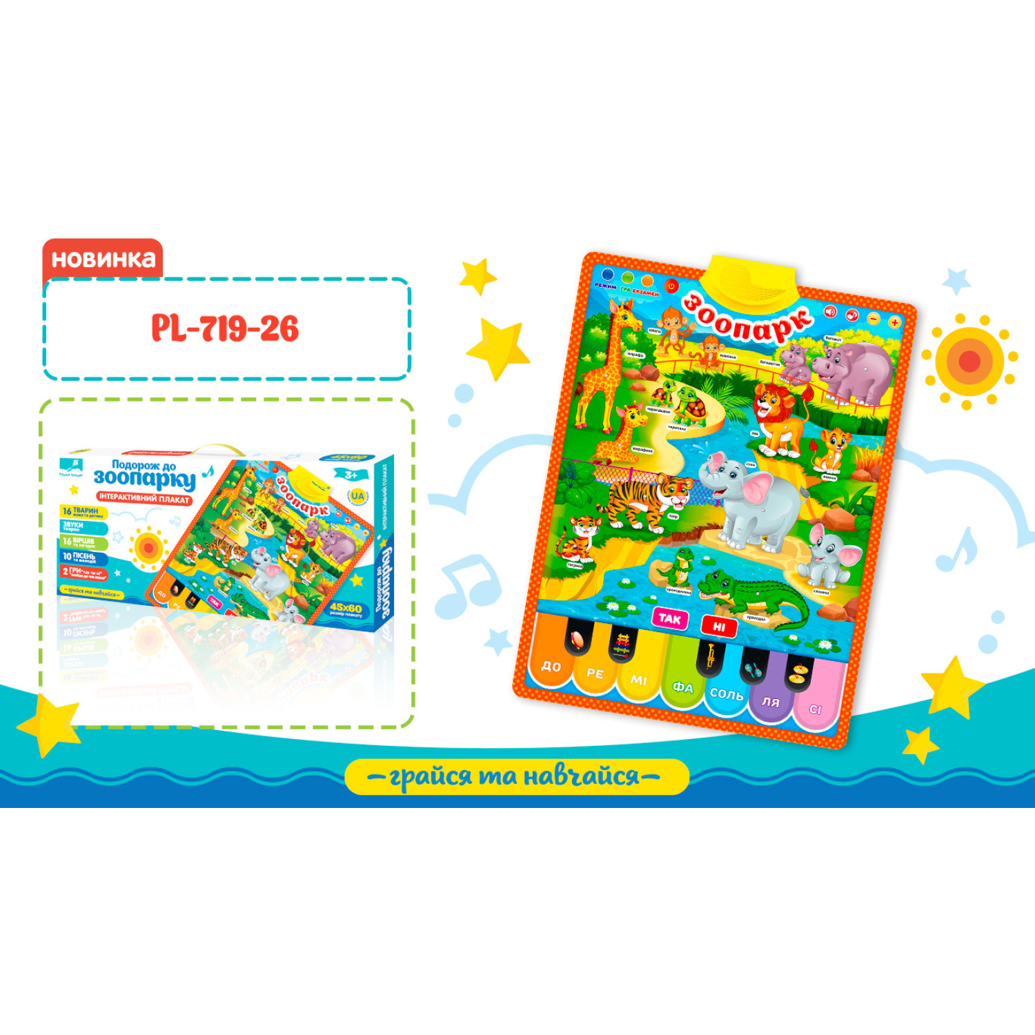 Интерактивный плакат с животными фермы "Мама и малыш" поможет выучить названия зверей и их детенышей, понять "большой / маленький", "громко / тихо", прослушать реалистичные голоса животных, сыграть на пианино и музыкальных инструментах, отгадать загадки, станцевать под весёлые мелодии и песни, поиграть в игры "Да или нет" и "Найди маму". На плакате 5 режимов озвучен на украинском языке