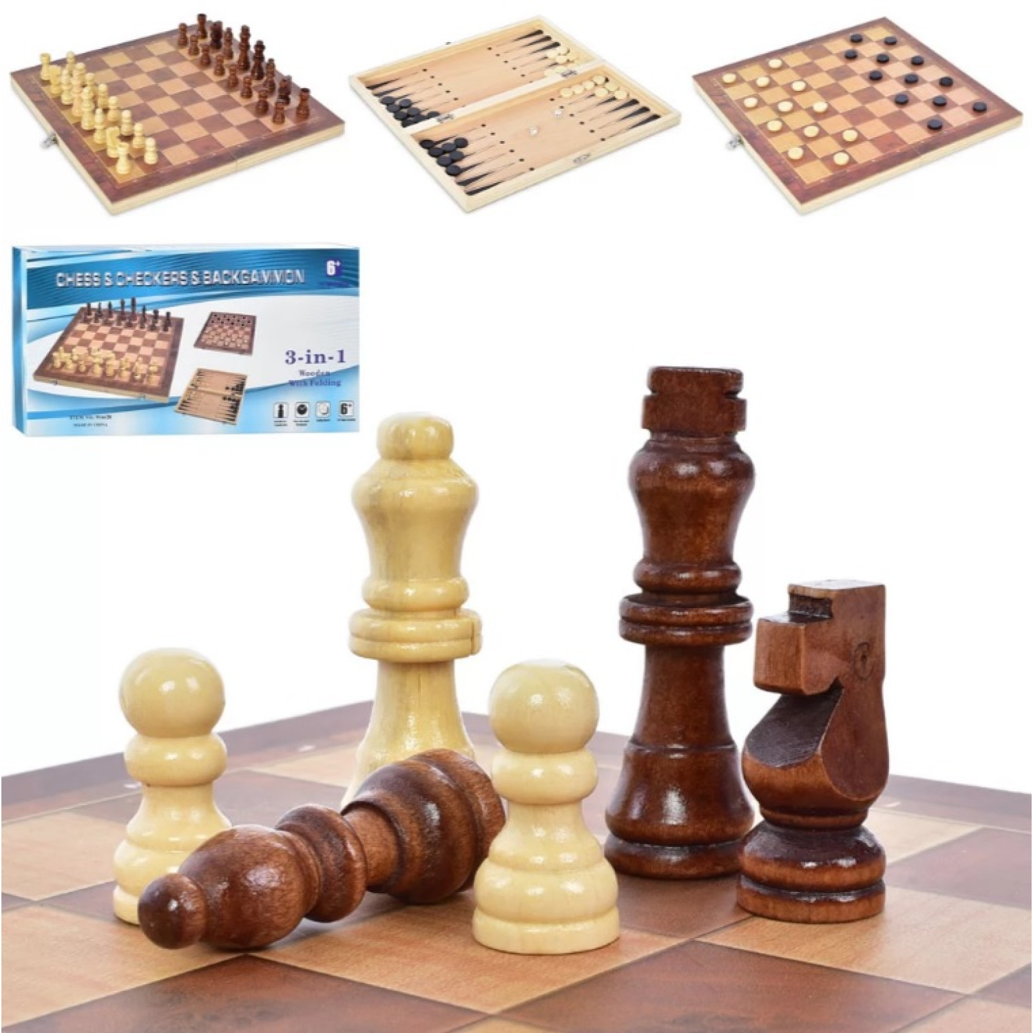 Шахи 34-34см, дерев'яні, 3в1(шашки, нарди), в кор-ці, 34-17,5-4см /12/