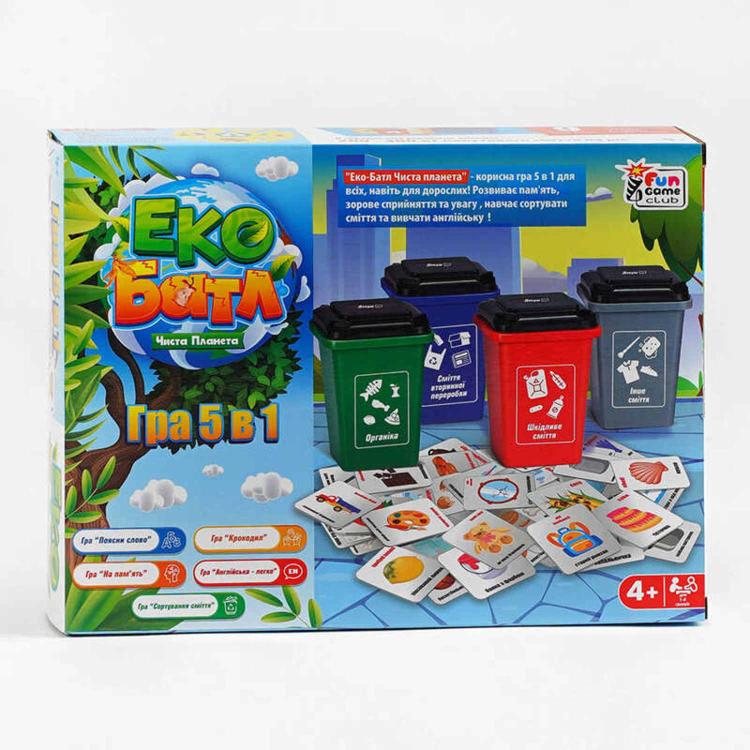 Особливості: Вікова категорія - 4+. Кількість гравців:1-4. 5 варіантів гри: 1 - "Поясни слово", 2 - "Крокодил", 3 - "Гра на память", 4 - "Англійська - легко", 5 - "Сортування сміття". Комплектація: 4 смітники різних кольорів, 100 ігрових карток, інструкція.
