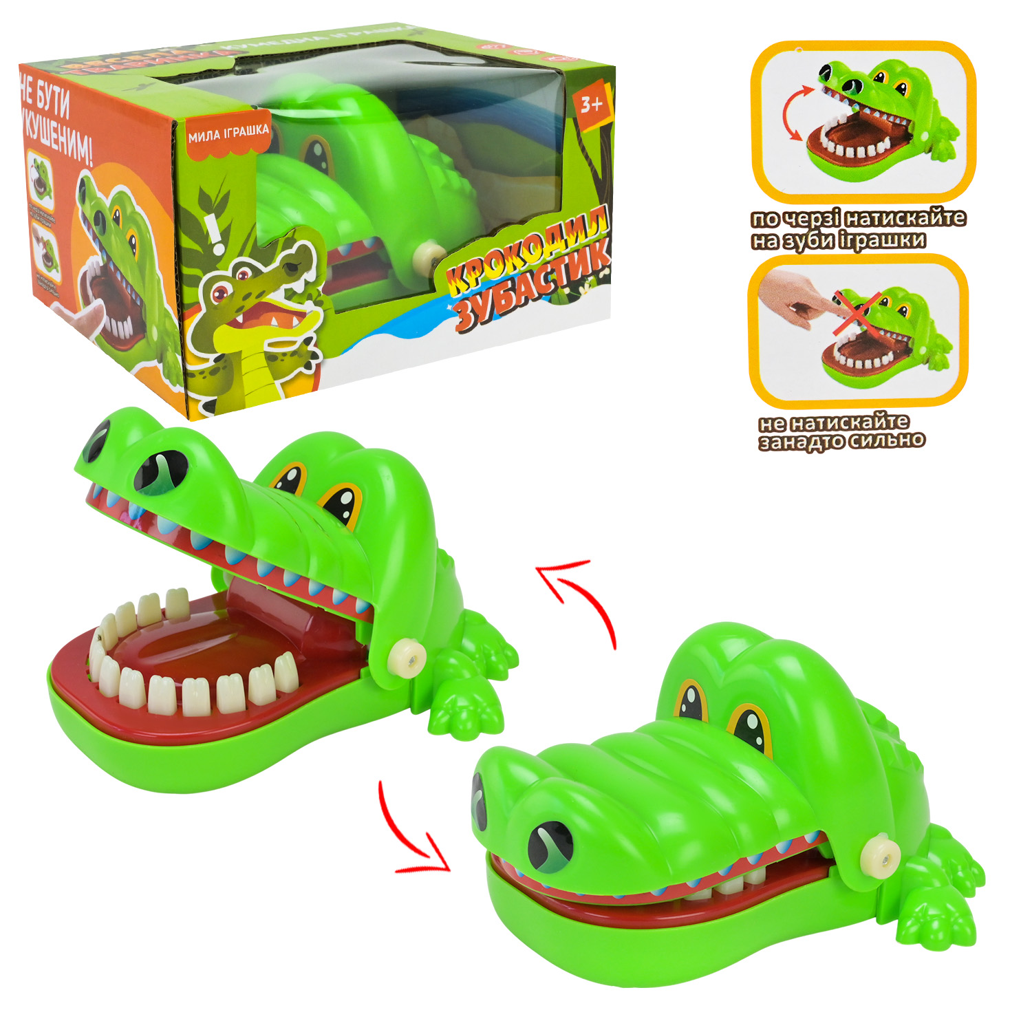 Гра дитяча "Зубастий крокодил". Потрібно нажимати на зуби крокодила по черзі. Кого крокодил "вкусить за палець" - той і програв. Розмір іграшки: 16х11х9 см.