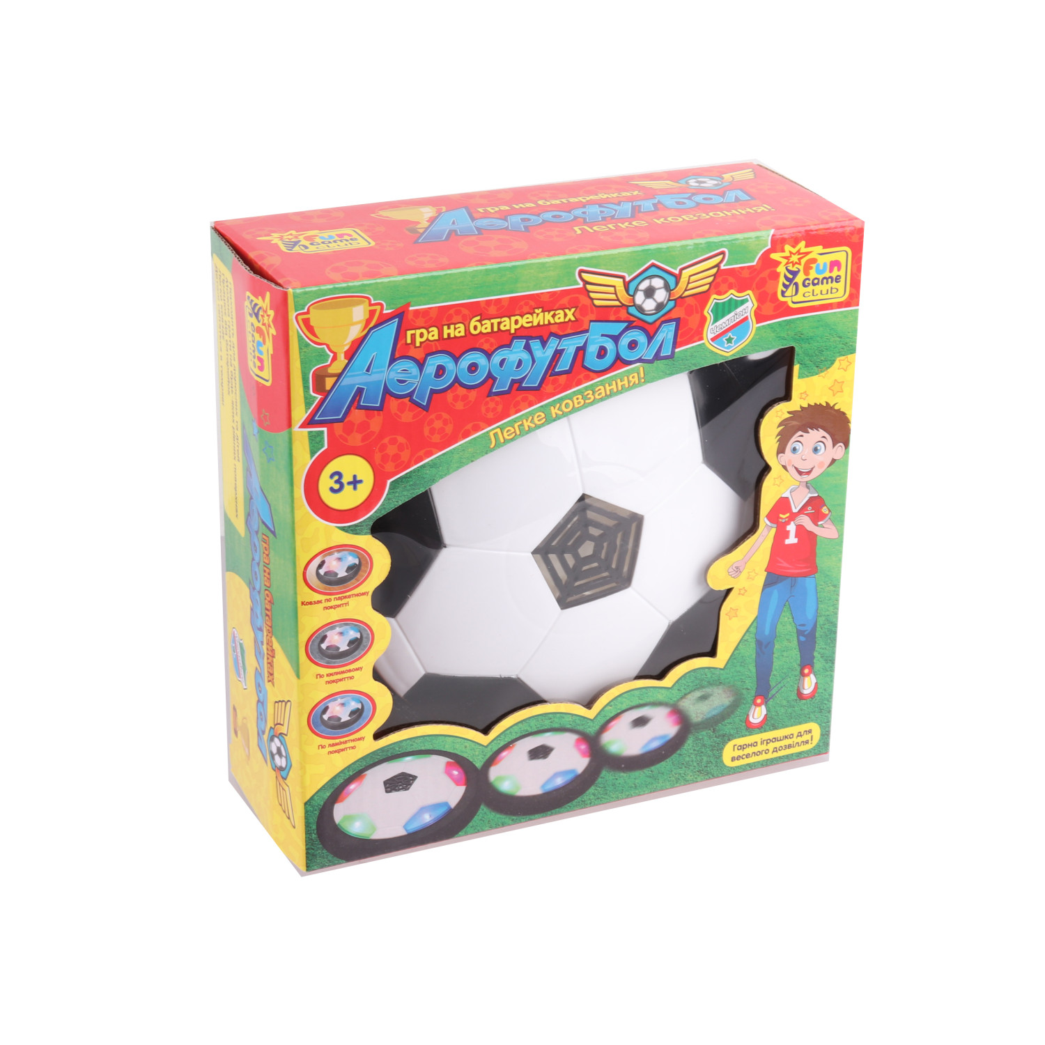 Игра "Аэрофутбол", упаковка - картонная коробка. Размер мяча: 18*18*7 см. Мяч имеет плоское основание и мягкие борта. Он буквально "парит" над полом и позволяет играть в безопасный футбол не выходя из дома. Игрушка оснащена яркой подсветкой. Источник питания - 4 батарейки типа АА (нет в комплекте).