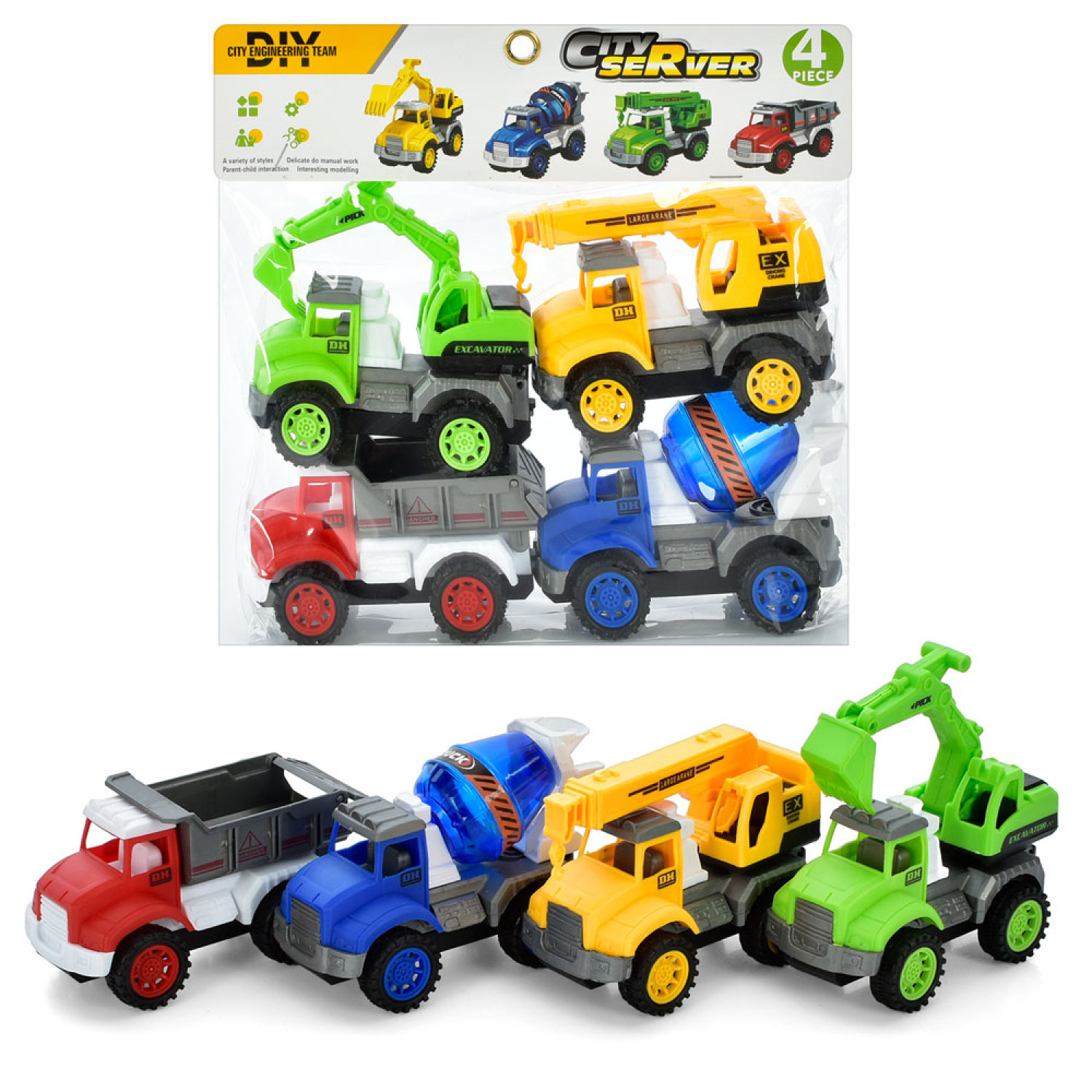 Особливості: В наборі 4 машинки будівельної техніки. Розмір машинки 10 см. Виконані з міцного пластику. Упаковка: пакет 27х23х5 см.