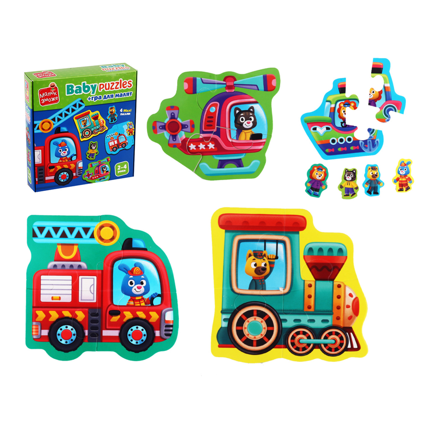 Особливості: Набір дозволяє скласти 4 картинки. Пазли виконані у достатньо великому розмірі, що значно облегшить гру. Гра розрахована для дітей віком 2-3 роки. Ігрові елементи виготовлені з міцного картону.