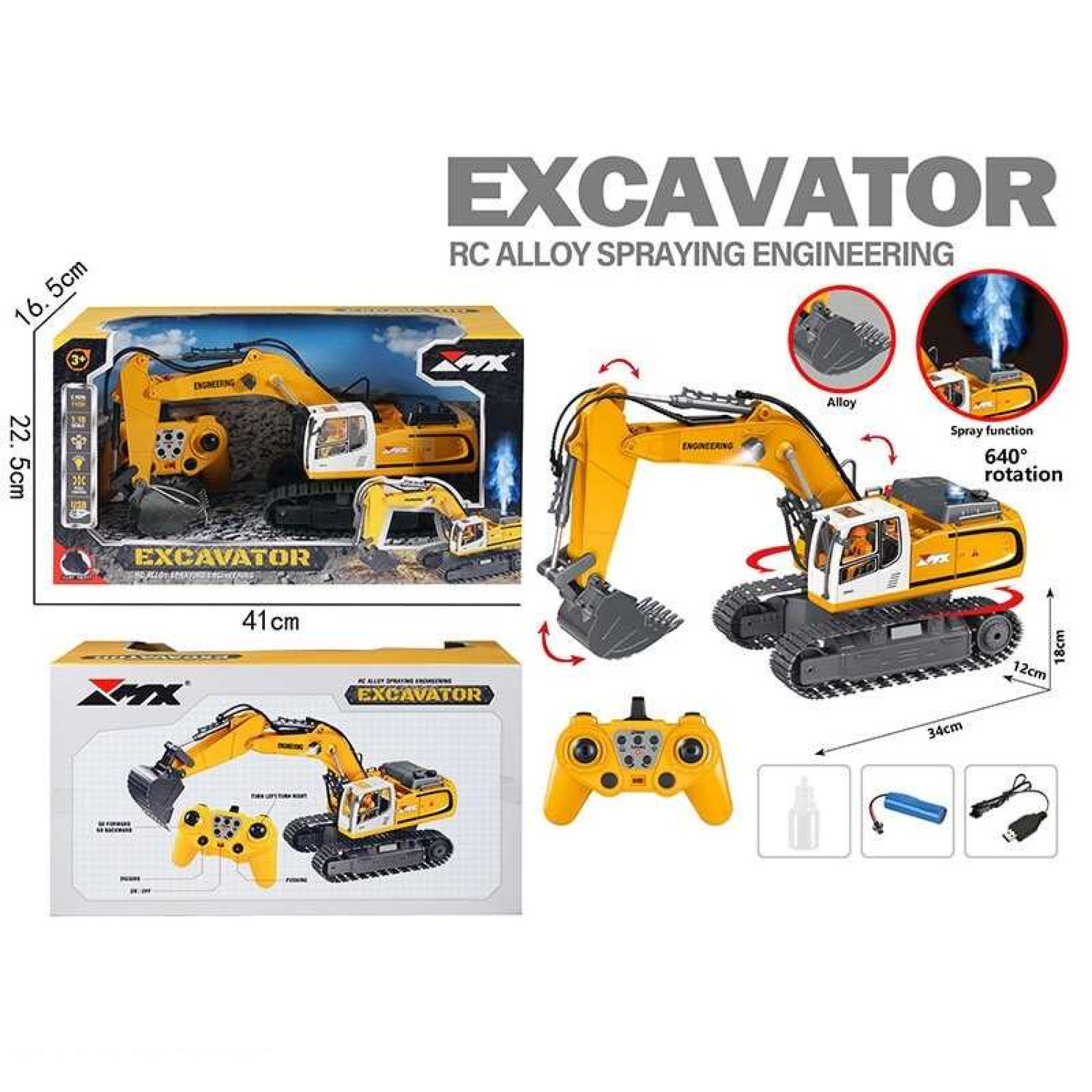 Особливості: Розміри іграшки: 34х12х18 см. Деталізований та продуманий дизайн. Автоматичний рух ковша (активується кнопками на пульті). Автоматичне обертання платформи. Підсвічування. Працює від акумулятора 3.7V, що разом із USB-кабелем додано до комплекту. Пульт 2.4 GHz працює від 2-х батарейок типу "АА" (до комплекту не додано). Металопластикова модель. Режим демонстрації. Звук (можна вимкнути). Масштаб: 1:18. Гусеничний хід. Парогенерація. Рухи: вперед/назад, вправо/вліво.