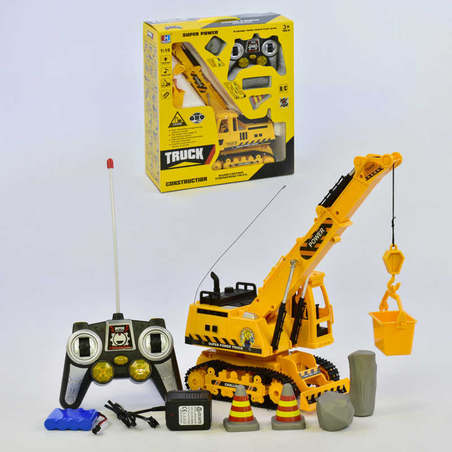 Робота підіймального механізму крана супроводжується реалістичними звуками, в кабіні водія вмикається підсвічування. У комплекті: екскаватор, пульт д/у, зарядний пристрій, набір дорожніх огороджень, місткість для підйому вантажу, елементи, що імітують вантаж. Живлення крана - акумуляторна батарея 4,8 V (в комплекті). Живлення пульта - 4 батарейки типу "АА" (не входять в комплект). Відповідні кнопки на пульті управління активують: рух техніки (вперед, назад, вліво, вправо), обертання техніки навколо своєї осі, роботу підіймального механізму.