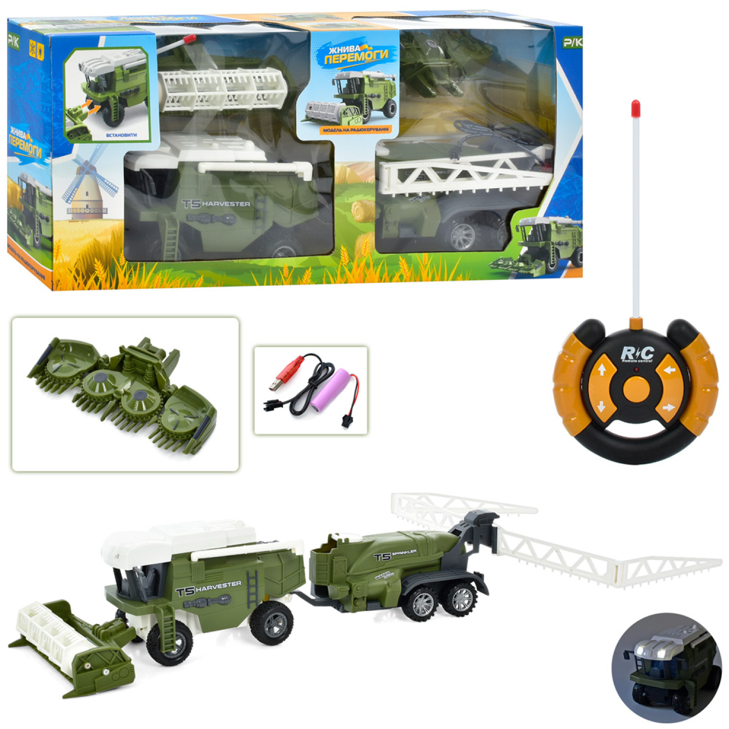 Р/В комбайн 21см,, аккум, USB зарядка, гумові колеса, причіп, в кор-ку, 59-24-12см /9/