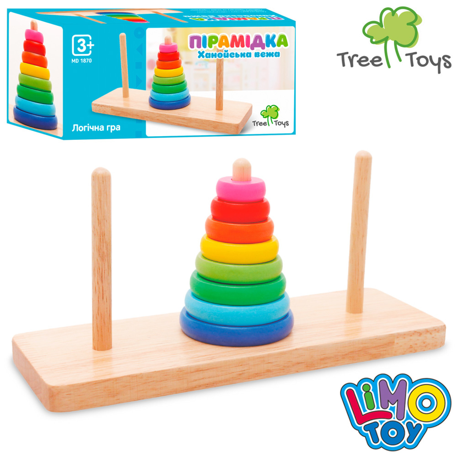 Дерев'яна іграшка "Пірамідка" має у комплекті підставку та 8 кілець. Пофарбована у яскраві кольори безпечною фарбою. Упаковка: коробка 23,5х11х8 см.