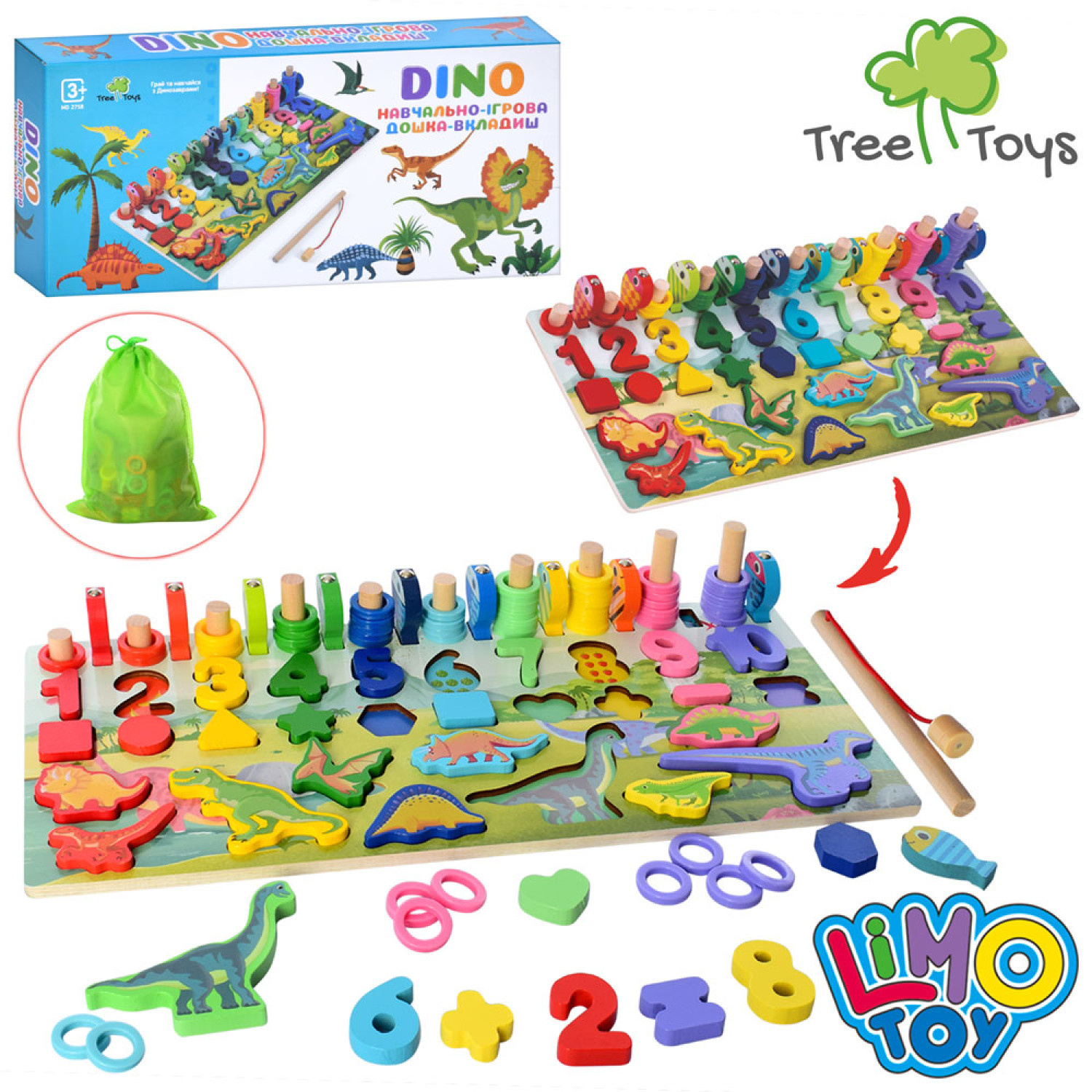Дерев'яна іграшка Центр розвиваючий ігрове поле 40-18см, кольорові кільця, риболовля (магнитна, 1 вудка, рибки 10шт), цифри,динозаври, в кор-ці, 41-19-5см /20/