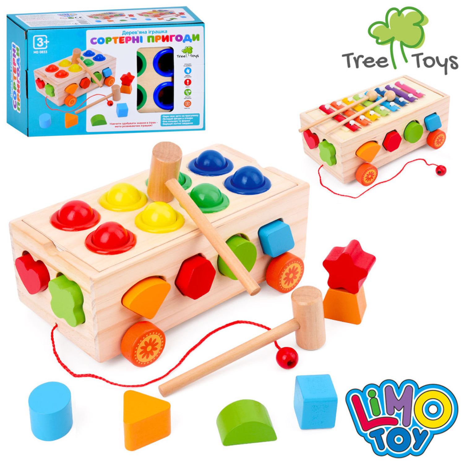 Дерев'яна іграшка Центр розвиваючий каталка (на шнурі), 23,5см, сортер, фігурки, 2 види(стукалка, ксилофон), в кор-ці, 24,5-16-9,5см /16/
