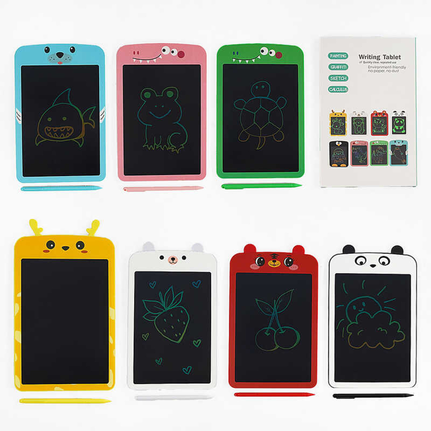 Особливості: Дошка для малювання виконана у вигляді тварини. LCD дисплей та стилус. Кольоровий екран. Розміри екрана - 12.5х17.5 см. Натискання на "ніс" тваринки стирає малюнок. Функція блокування. Товщина дошки складає 0.6 см. Працює від батарейки, яка входить до комплекту.