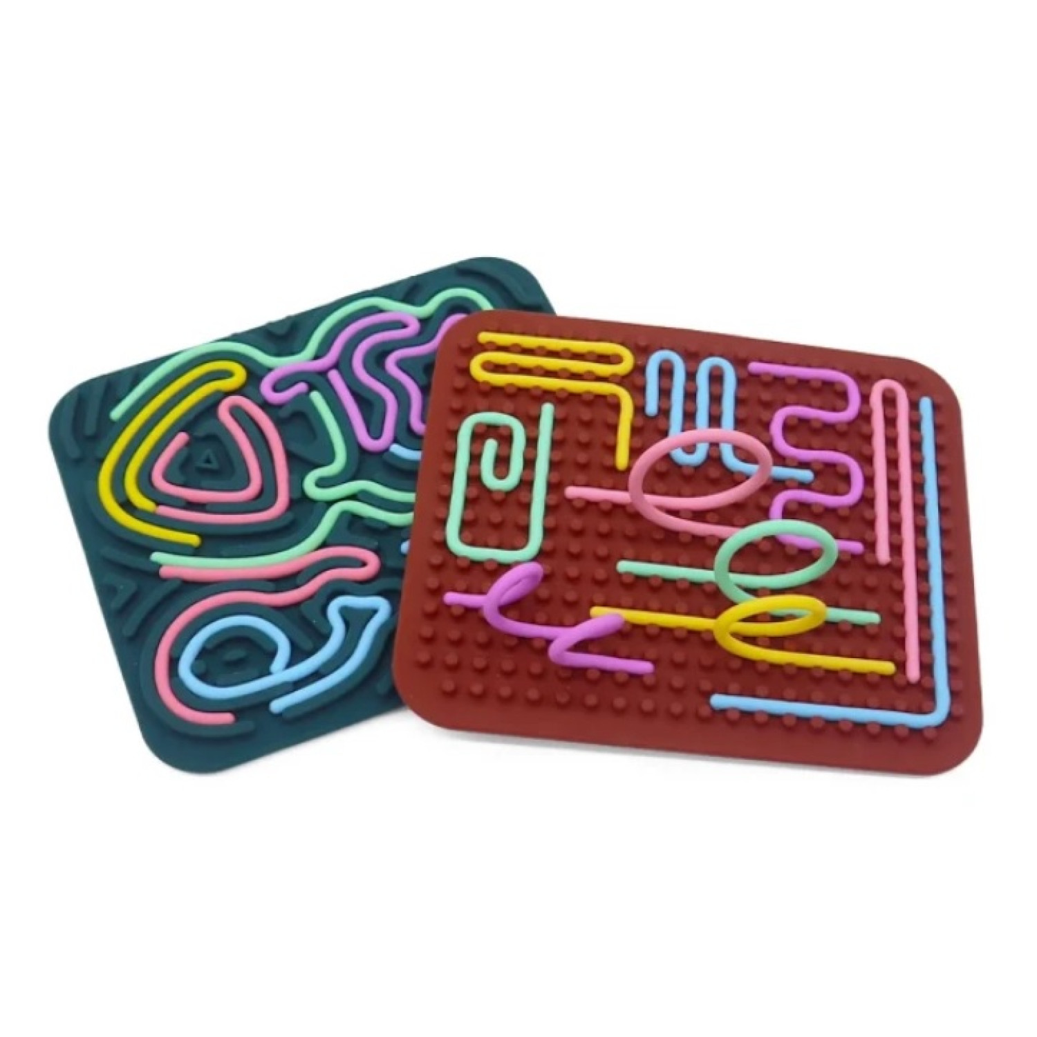 Унікальна сенсорна іграшка, яка допомагає дітям досліджувати тактильні відчуття, розвивати дрібну моторику та знижувати рівень стресу.Одна сторона має рельєфні доріжки, які можна вставляти гнучкі силіконові шнурки, створюючи різноманітні візерунки і композиції. Друга сторона покрита рівномірно розташованими опуклими точками, що дозволяють експериментувати з формами, літерами та цифрами, вставляючи шнурки у вільному порядку. Такі заняття сприяють концентрації та заспокоюють нервову систему. Килимок виготовлений із сертифікованого силікону, безпечного для дітей та навколишнього середовища. У комплекті килимок та 10 гнучких шнурків для захоплюючої гри. Розмір: 15х17 см.