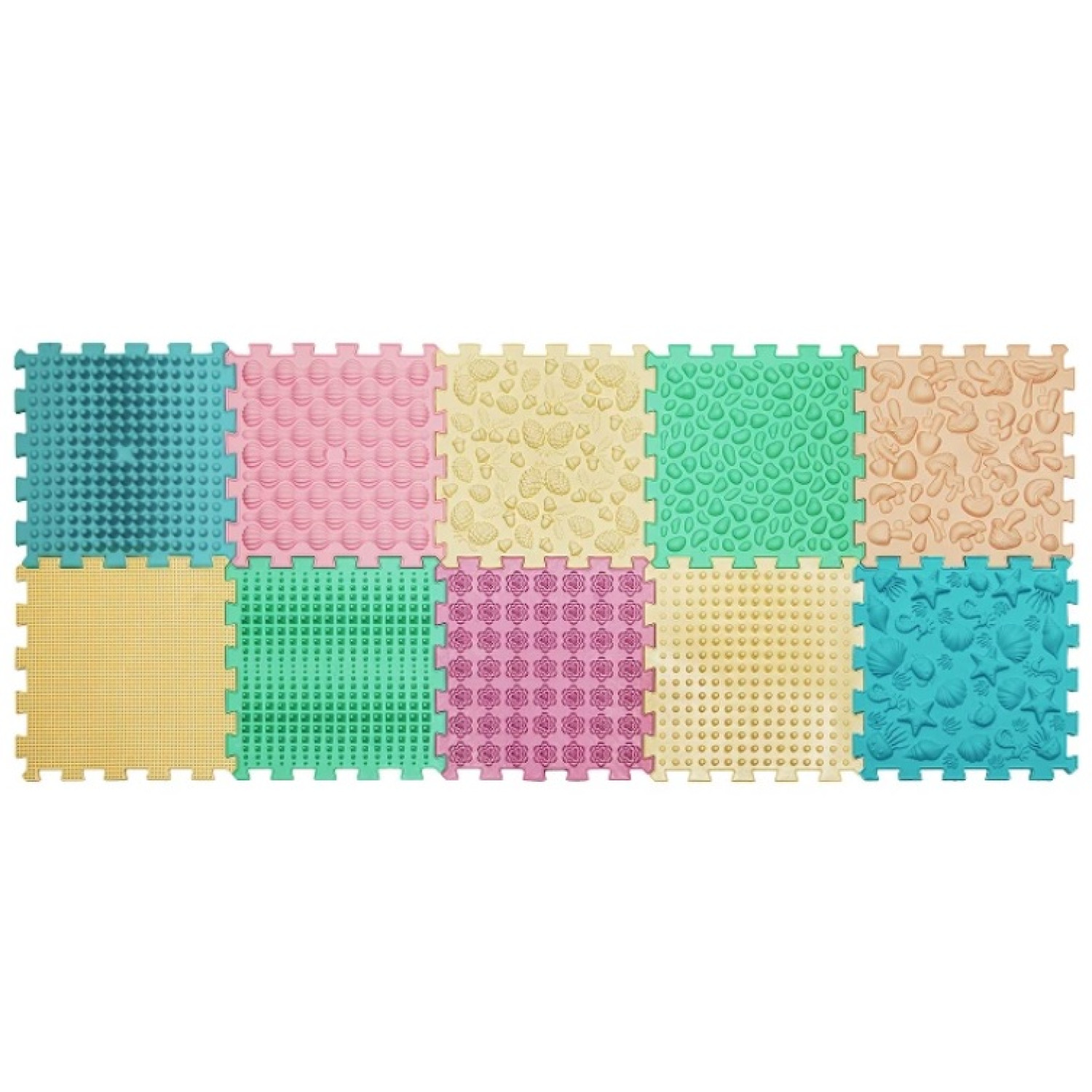Ніжні пастельні кольори гарно вписуються в інтер`єр, килимок виглядає естетично привабливо та вишукано. Масажний килимок складається з 10 пазлів. Виробляється з гігієнічного, гіпоалергенного матеріалу на основі ПВХ. Розмір модуля: 26x26 см. Що може масажний килимок: сприяє правильному формуванню дитячої стопи, покращує тонус мязів, зміцнюючи повздовжнє і поперечне склепіння стопи, активно впливає на покращення кровообігу, знімає напругу в ногах, впливаючи на нервові закінчення. Застосування: Профілактика плоскостопості, клишоногості, вальгусної деформації та інших деформацій. Профілактика варикозного розширення вен, артрозу та артриту. Полегшення при відчутті втоми в ногах. Усі пазли виробляються з одного матеріалу - безпечного, гіпоалергенного ПВХ без шкідливих домішок. Але завдяки різним текстурам відчуваються по-різному. Травка, мушлі, галька, гриби відносяться до більш мяких пазлів. Вежі, Їжачки, Морські, Жолуді - до середніх. Піраміда, Шипи, Лотос, Шишки відносяться до більш твердих пазлів. Вплив поверхонь різної твердості надає найкращий ефект для масажу, тренування стоп та сенсорної інтеграції.