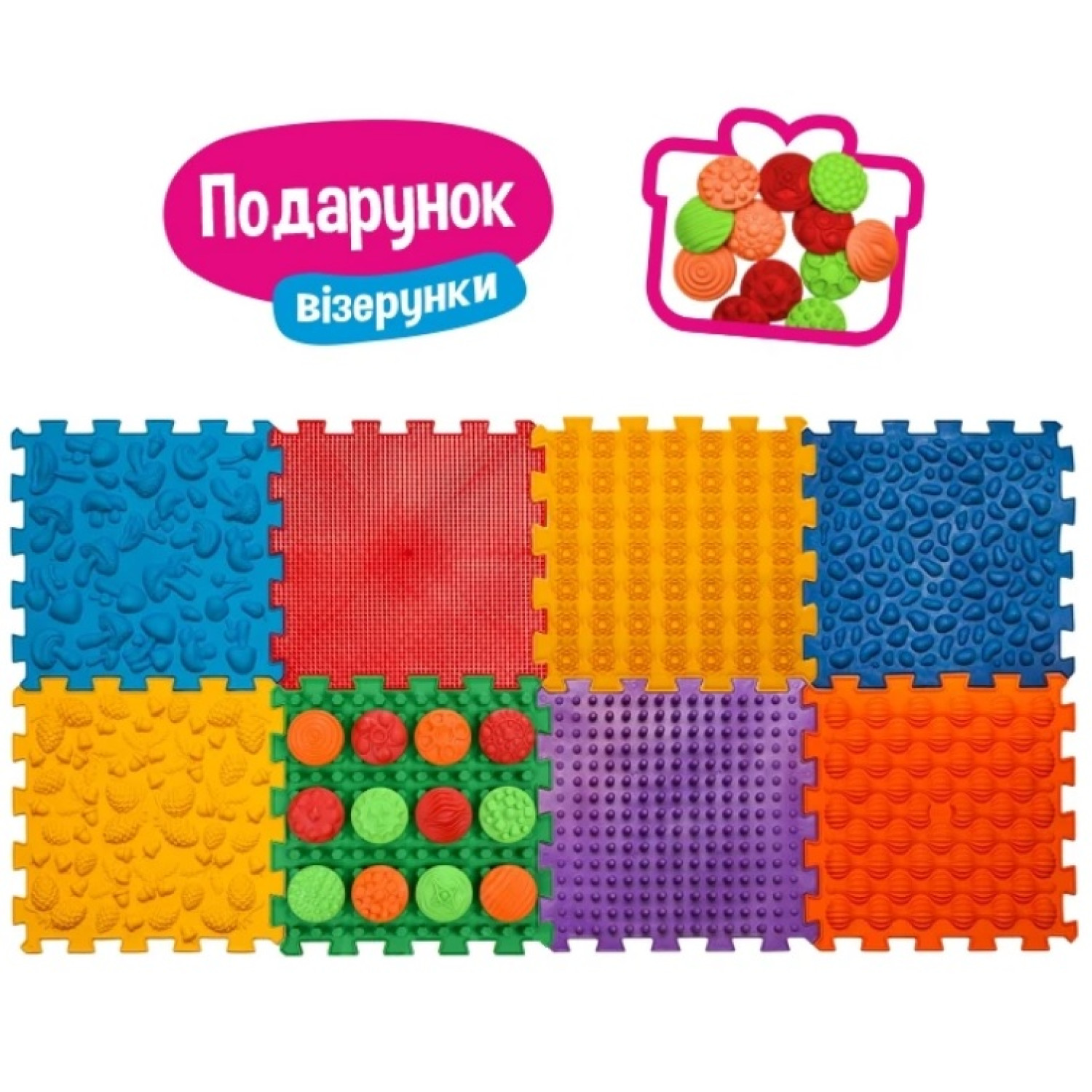 Масажний килимок складається з 8 пазлів + 12 модулів Візерунки. Виробляється з гігієнічного, гіпоалергенного матеріалу на основі ПВХ. 12 видів візерунків мають різну поверхню, що добре розвиває тактильні відчуття та створює різний масажний ефект. Деталі кріпляться на виступаючі "стовпчики" пазла. Дитина може викладати на пазл різнокольорові візерунки або сортувати їх за кольором, викладати їх в довільному порядку, або спробувати викласти фігуру, як з мозаїки. Деталі добре тримаються, тому по ним можна вільно ходити, масажуючи стопи. Розмір модуля: 26x26 см. Діаметр одного модуля-деталі 5 см.