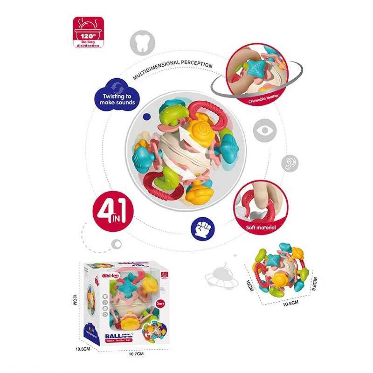 Брязкальце 4 в 1: тріскачка, пальчикові ігри, прорізувачі, брязкання, обертання частин кулі, в кор. /60/