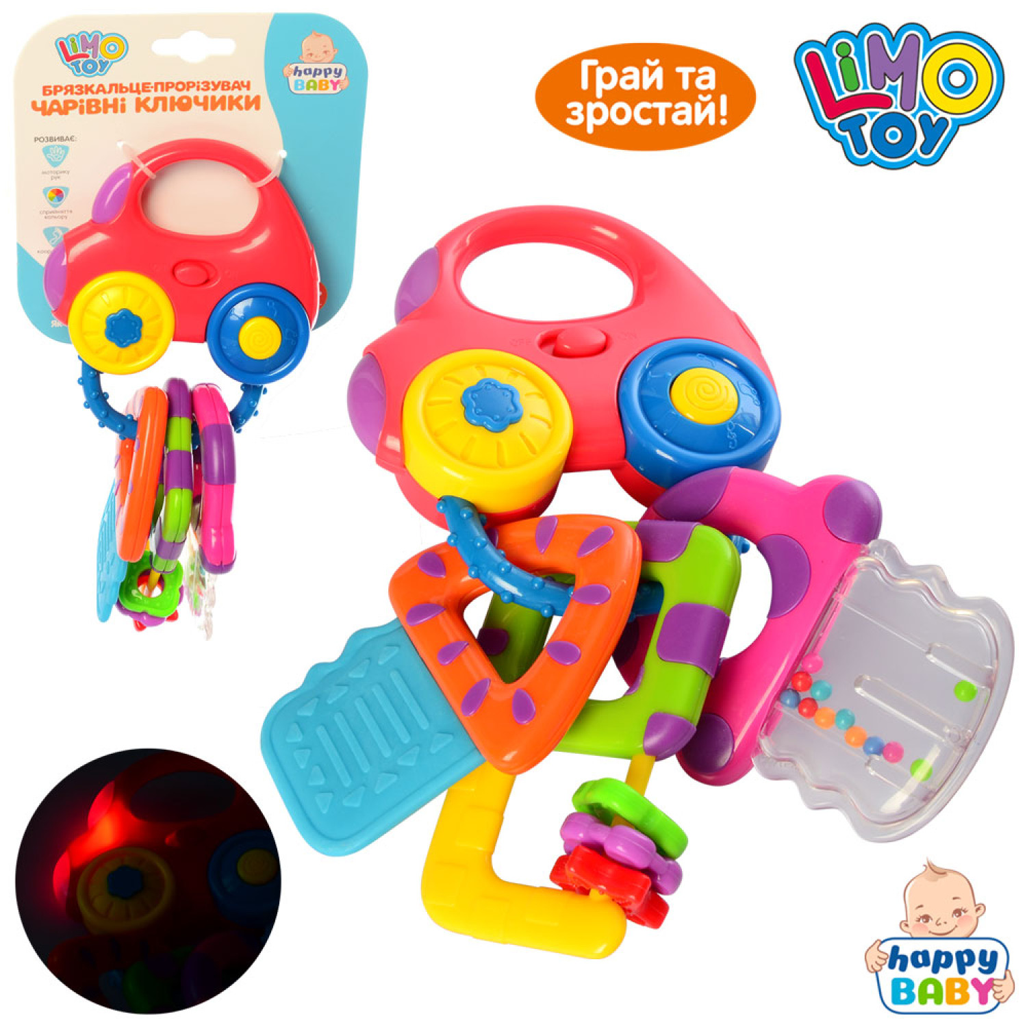 Брязкальце брелок, 17см, муз, звук, світло, прорізувач, на бат(табл), на листі, 12-22-5см /48/