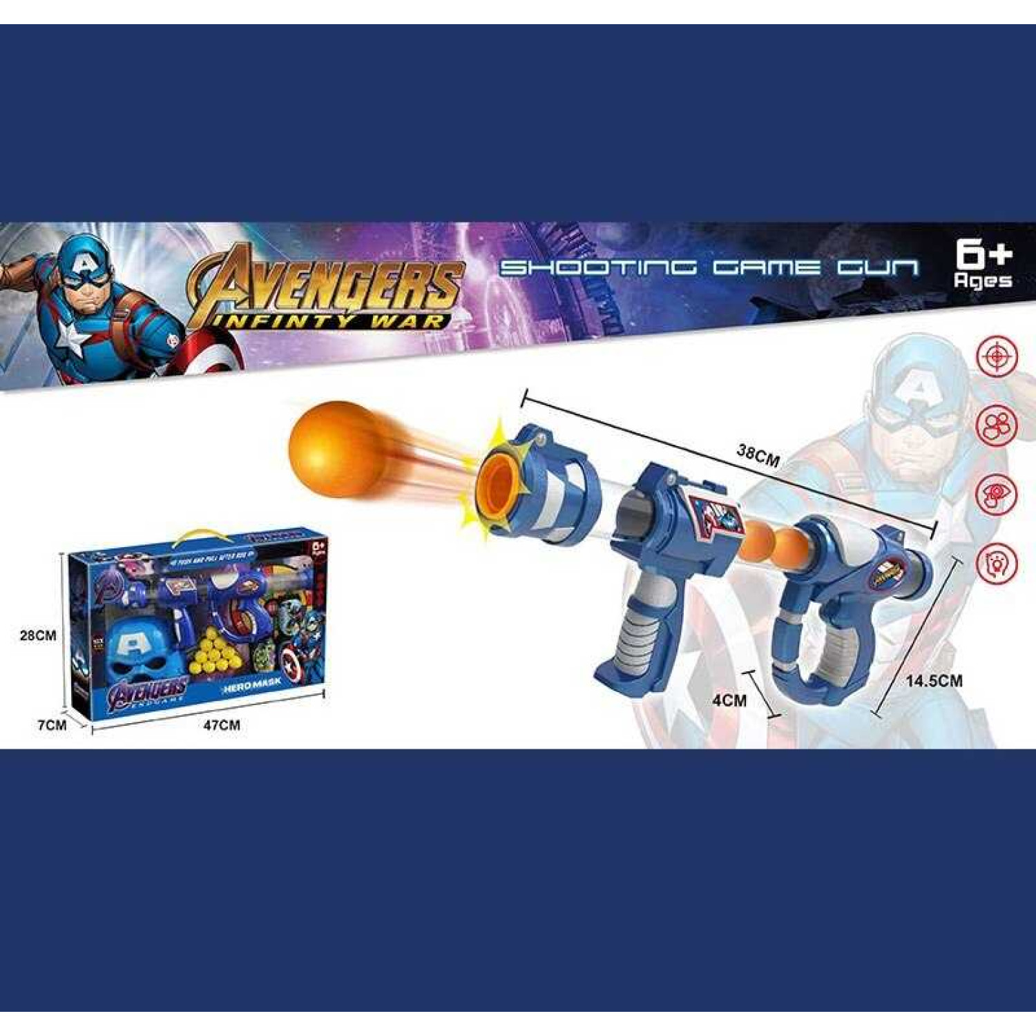 Особливості: Розміри автомата: 38х4х14.5 см. Зброя має помповий принцип роботи й не потребує батарейок для роботи. До набору включено 10 м'яких кульок для заряджання автомата. У комплект входять 4 мішені для стрільби та маска героя.