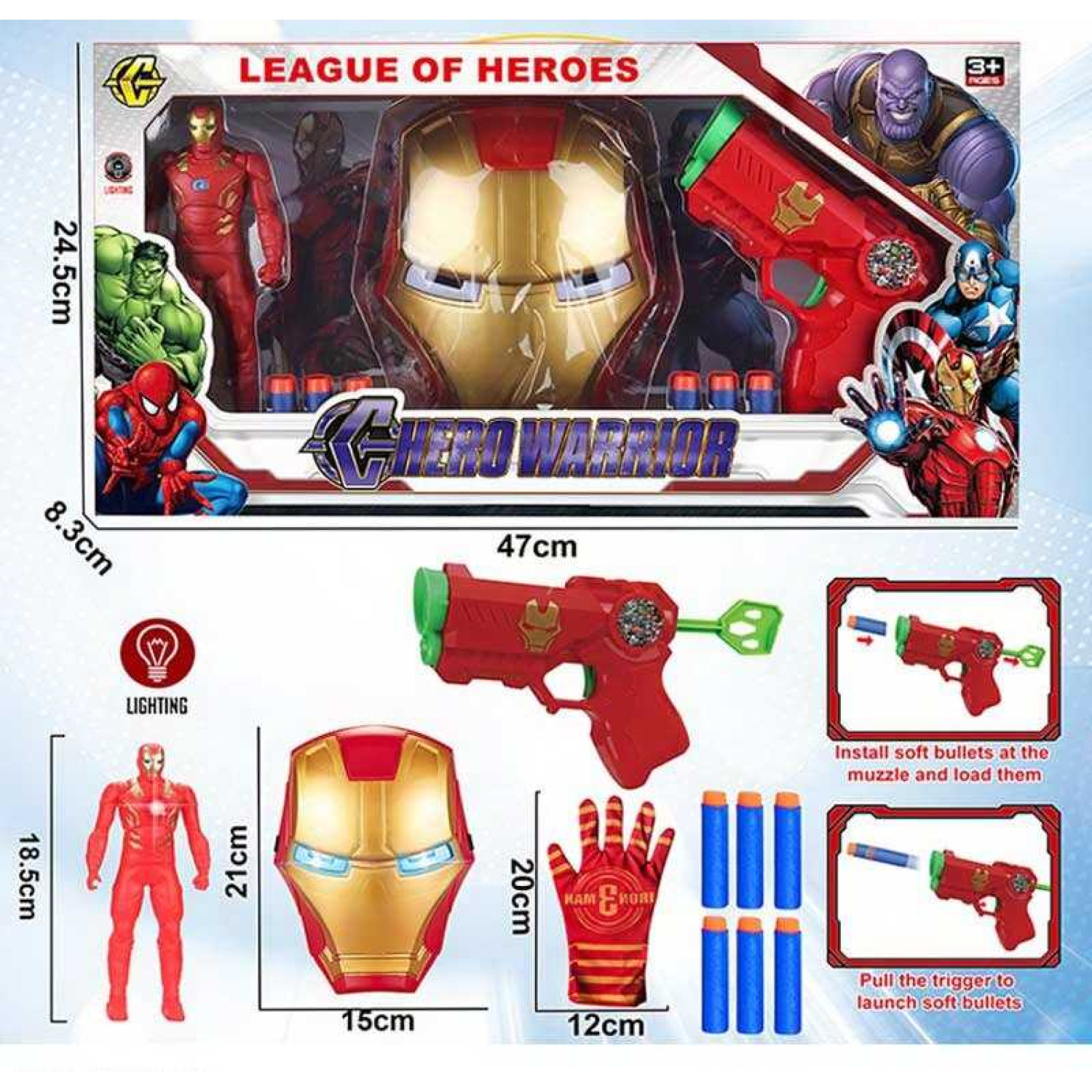 Набір героя маска з підсвічуванням, механічний пістолет, рукавиця, 6 м’яких патронів, фігурка підсвічується, висота героя 18 см, в кор. /30-2/