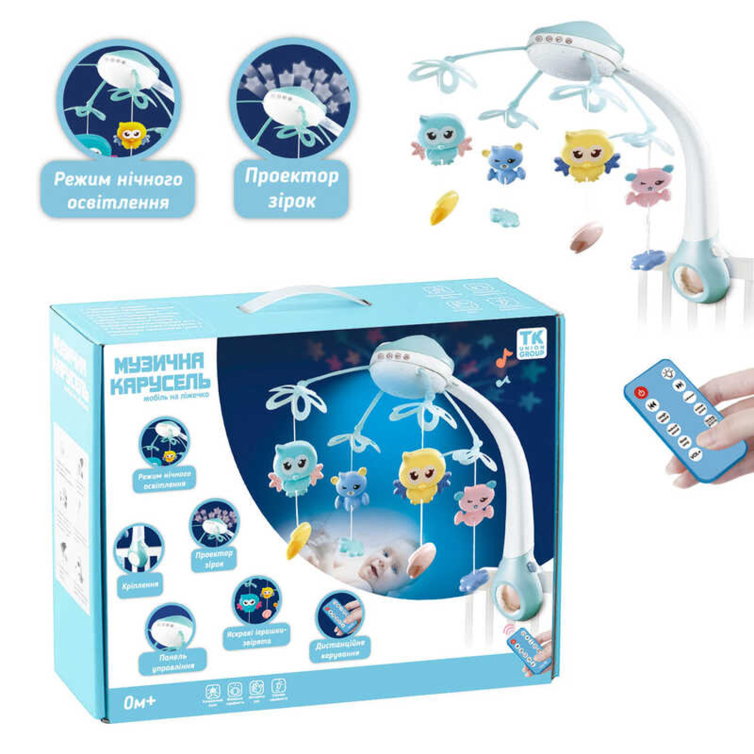 Проектор оборудован 4-мя сенсорными кнопками: Мобиль работает от дистанционного пульта Музыкальная панель насчитывает в себе около 20-ти мелодий, песен, колыбельных и звуков: 3 вида смеха 2 вида природы 3 звука музыкальных инструментов 8 звуков животных колыбельные. Эффекты работают от 3-х батареек ААА - не входят в комплект. Упаковка: Коробка