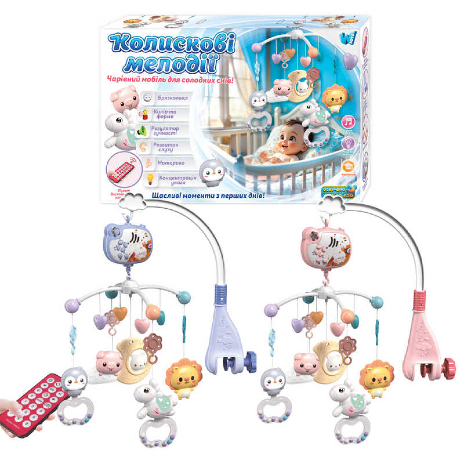 Карусель "WToys", 2 види, ОЗВУЧ. УКР. МОВОЮ, 5 підвісок-брязкалець, гумові елементи, обертання, підсвічування, таймер, регулювання гучності, мелодії, колискові, проєкція, пульт, в кор, МІКС ВИДІВ /24/