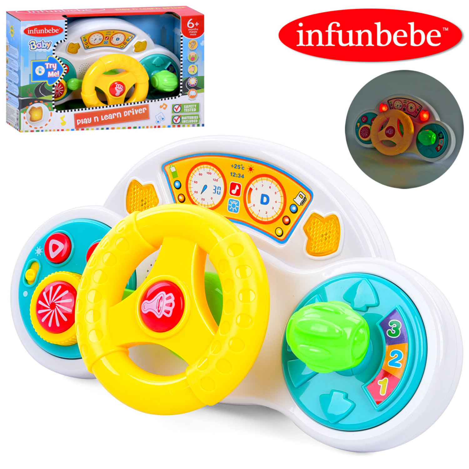 Особливості: Автотренажер дитячий у вигляді керма. Розмір іграшки 28х17 см. Присутні світлові, музичні та звукові ефекти. Тип живлення: батарейки. Упаковка: коробка 33х20х9,5 см
