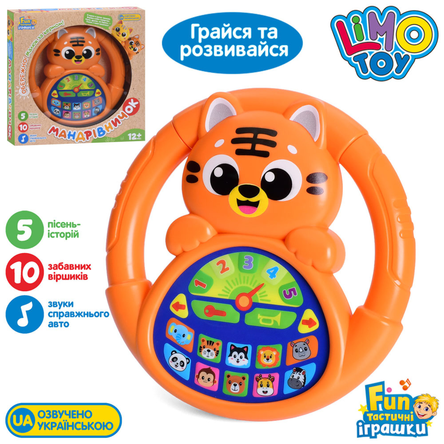 Особливості: Розмір іграшки 18 см. Озвучено українською мовою. Звуки тварин, 5 пісень, 10 віршів. Регулятор гучності. Тип живлення: батарейки. Упаковка: 23х22,5х4,5 см.