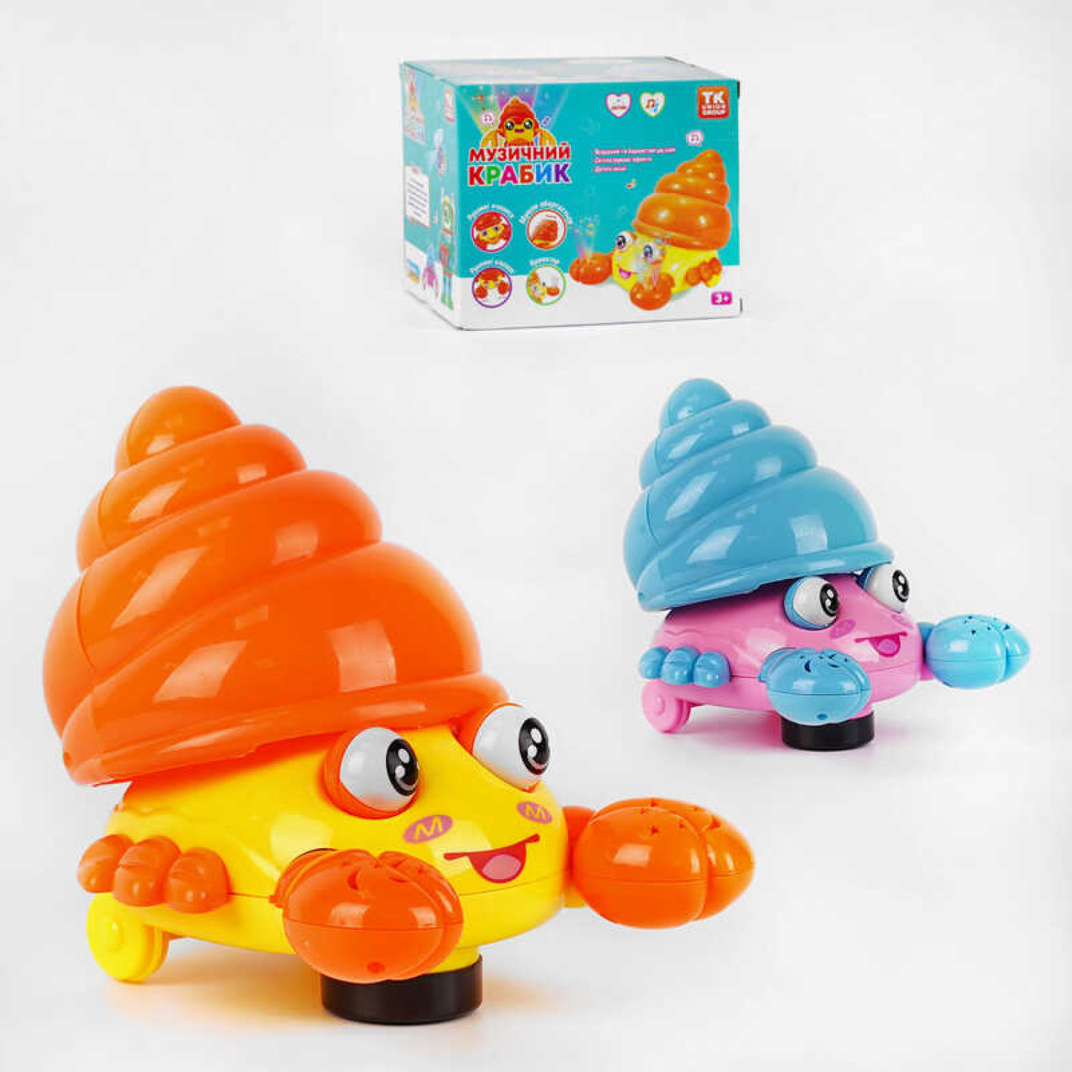Особливості: Іграшка представлена у двох кольорах. Має рухомі клешні з підсвіткою, як у проєктора. Мушля краба виконує роль капелюха на голові та рухається при вмиканні. В іграшки є колесо вільного руху, якщо немає потреби його використовувати, можна надіти заглушку. Іграшка працює від 3 батарейок типу АА (до комплекту не входять). Всі рухи іграшки супроводжуються пісенькою, яка виконується українською мовою.